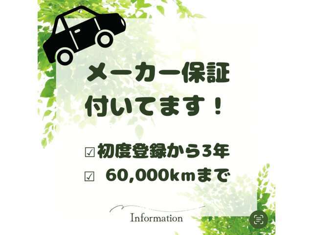保証 | 保証付 詳細については、販売店にご確認ください。 保証期間:5年 保証距離:60,000km メーカー保証が引き継げますので、万が一の故障の時も安心です!3年60,000kmの一般保証と5年100,000kmの特別保証でお守りいたします!詳しい内容は店舗スタッフまでお尋ねください♪ |