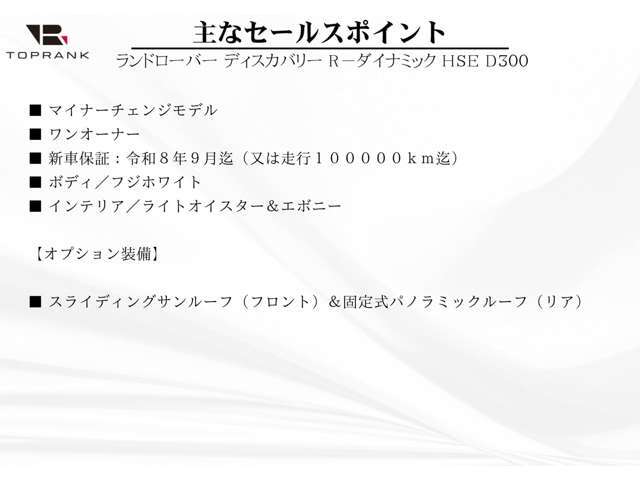 購入プラン内容(ランドローバー ディスカバリー Rダイナミック HSE D300 ディーゼルターボ 4WD サンル-フ アイボリ-革 7人乗り 1オーナー)