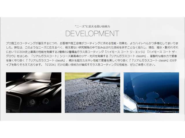 補足 | - | 弊社が手掛ける新車コンプリートカーへの豊富な施工実績をもとに、親水・疎水・撥水といったコート剤の特性はもちろん、オーナー様の保管状況や使用状況、そしてお好みを考慮した施工メニューをご用意しております。 |