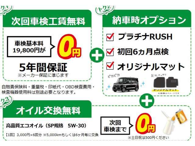 法定整備 | 法定整備付 法定12ヶ月点検付※貨物など一部車両は6ヶ月点検 お渡し前の分解点検整備は当社認証工場にて法定12カ月または24カ月点検をさせていただきます。得々パックを付けていただくことでエンジンオイル、オイルエレメント等の交換はもちろん、バッテリー点検、ワイパーゴム、エアコンフィルター等の部品交換をさせていただきます。 (お客様のご希望で別途実施させて頂く作業以外の工賃又は部品代をお客様にご請求する事はございませんのでご安心ください。) |