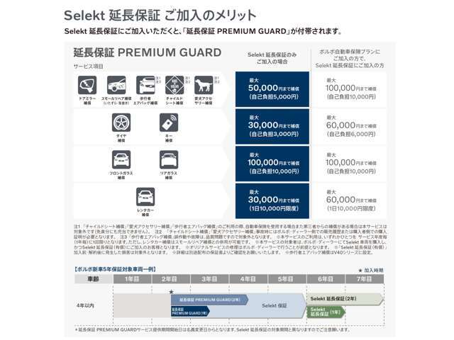 補足 | - | 初度登録3ヶ月から60ヶ月目までのSELEKT車両対象 詳細価格110,000 |