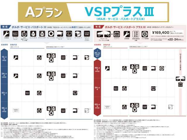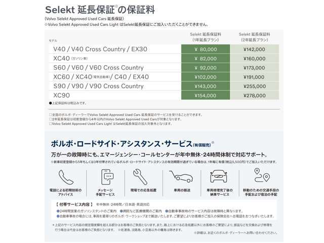 補足 | - | 60シリーズのPolestarは除く 下記期間のSELEKT車輛対象 4-5年目:初度登録3ヶ月~60ヶ月目まで 6-7年目:初度登録35ヶ月目以降84ヶ月目まで 8-9年目:初度登録59ヶ月目以降108ヶ月目まで 詳細価格169,400 |