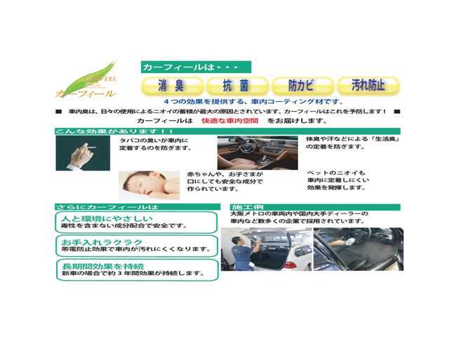 補足 | - | 驚異的な水キレで、雨が残らずボディから流れ落ち、雨ジミや水アカの固着を防止する、革新的な疎水性ガラス系ボディコーティング。 室内コーティング加工(カーフィール)とセット価格になります。 |