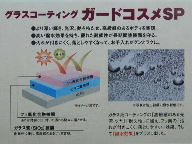 補足 | - | 次回車検までの必要な点検整備をお得にまとめた安心パック *車検時には別途諸費用等が必要となります。また、パックに含まれない整備・部品など別途有料になります。予め了承下さい。詳しくはスタッフにお尋ね下さい | ガラス質とフッ素化合物のハイブリッドボディコーティング(軽自動車クラス) |
