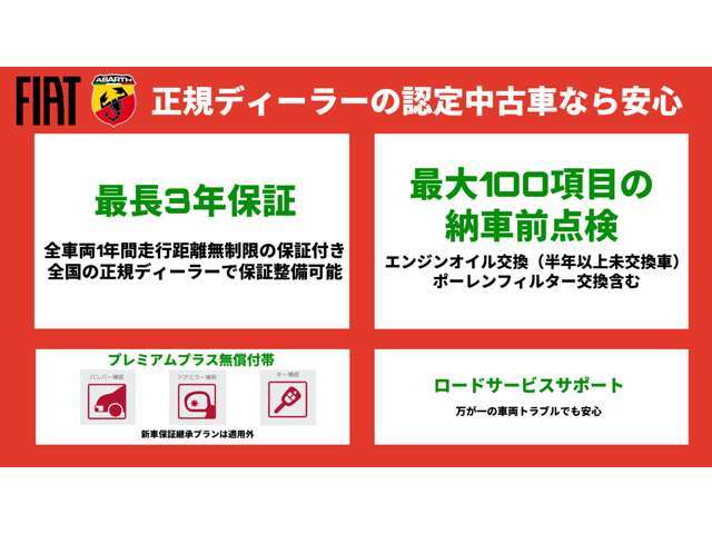 法定整備 | 法定整備付 法定12ヶ月点検付※貨物など一部車両は6ヶ月点検 メーカー指定の最大100項目点検を実施。詳細はお問合せ下さい。 |