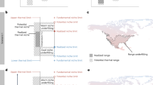 Inferring species’ thermal tolerance limits based on realized climatic niches can be confounded by non-physiological factors including biotic interactions, dispersal ability, and/or habitat patch size5,6. Studies using experimentally-derived estimates of species’ fundamental climatic niches have significantly advanced our knowledge of how species’ ranges conform to thermal tolerance limits at land and sea7,8 and how thermal physiological traits are asymmetrically conserved through evolution9. However, these studies have generally been limited in taxonomic coverage, with only one study focused on trans-realm comparisons7.