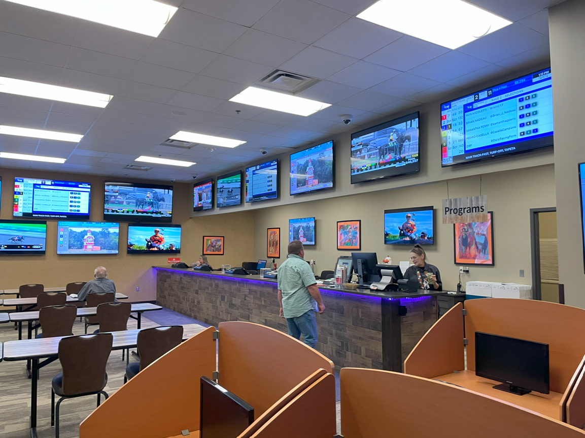 エントランスの奥にある馬券売り場。セパレートされた机に向かって集中して馬券検討が出来る環境が整えられている(もちろん無料で使用可)。