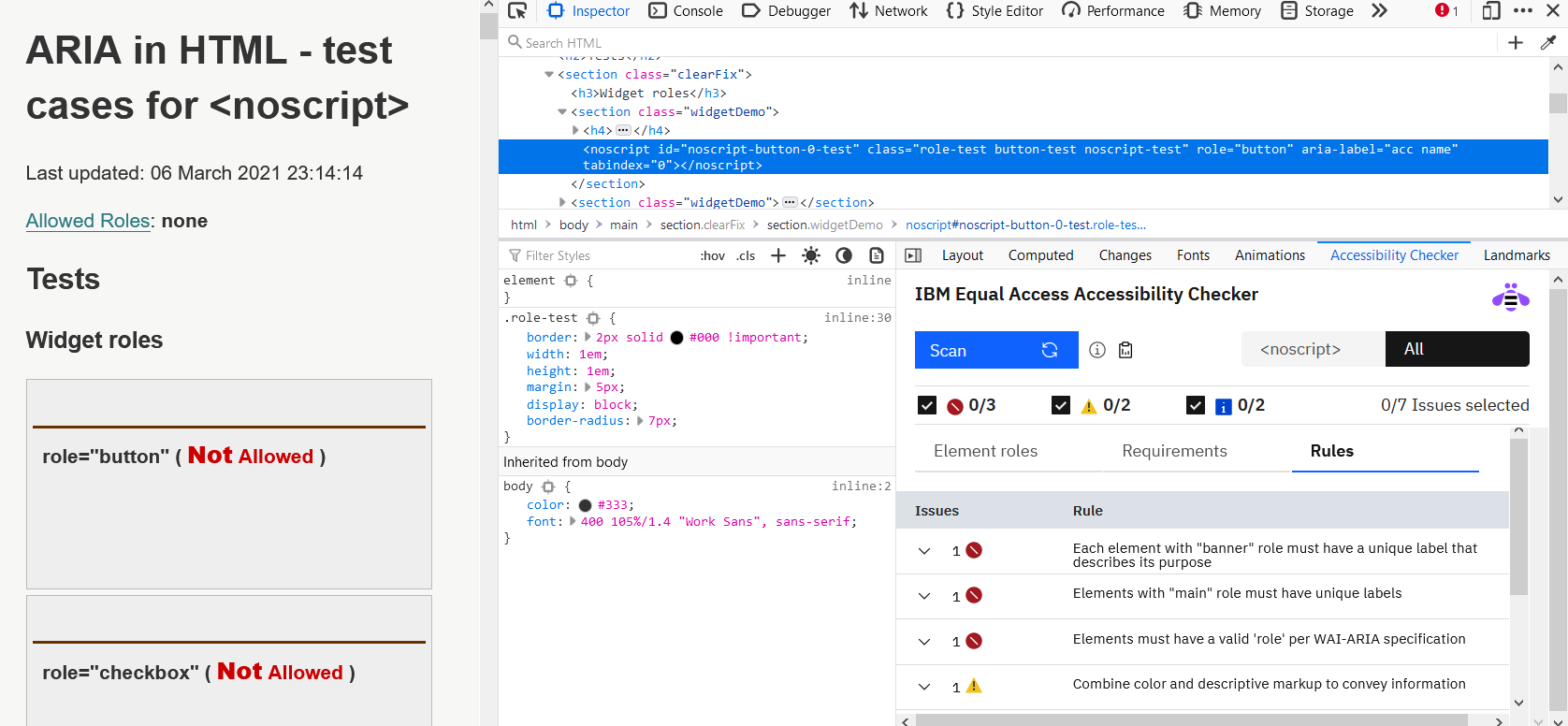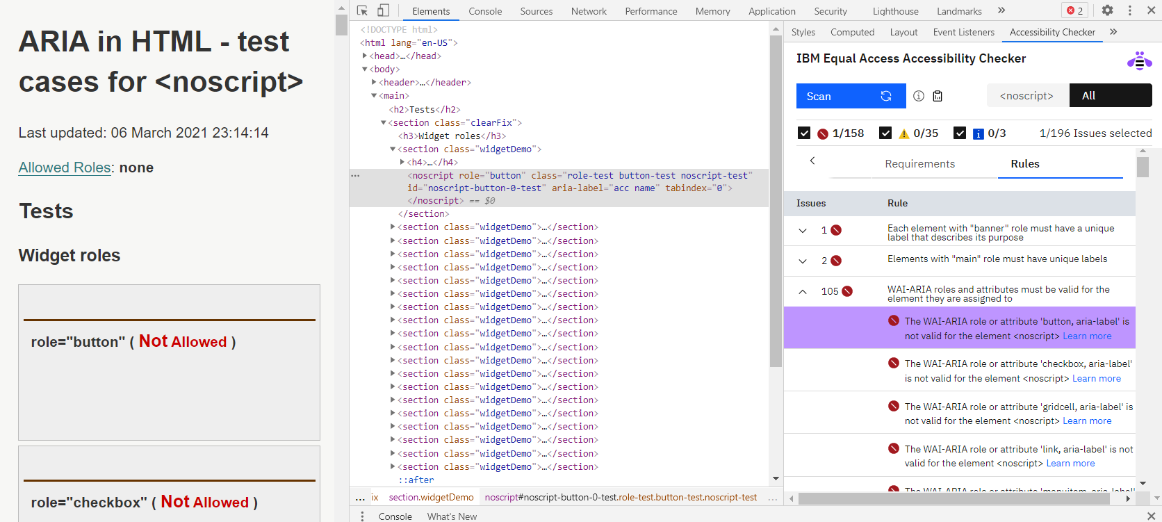 The Chrome extension finds all of the role and attribute violations on the noscript elements, but the Firefox extension misses them entirely.