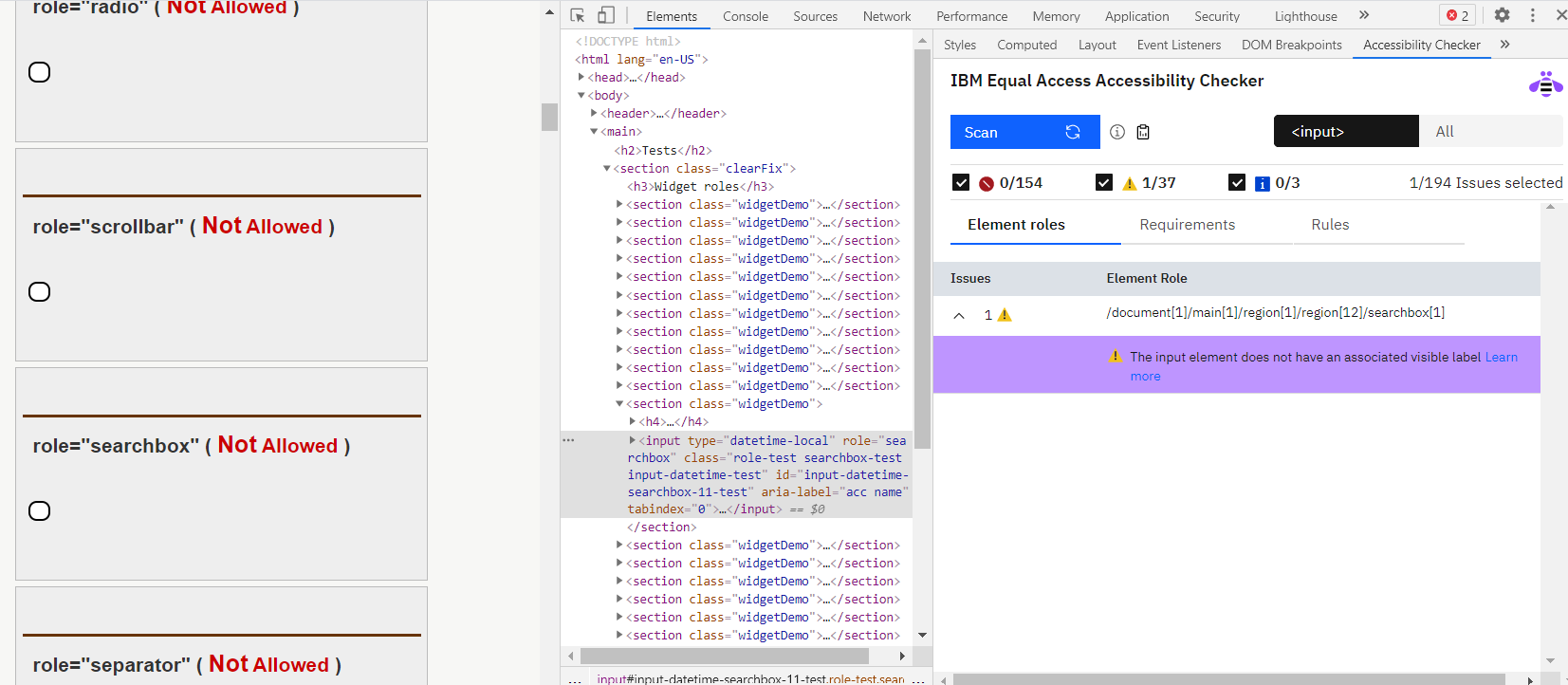 The following screen snapshot shows no violation for searchbox role on datetime-local: