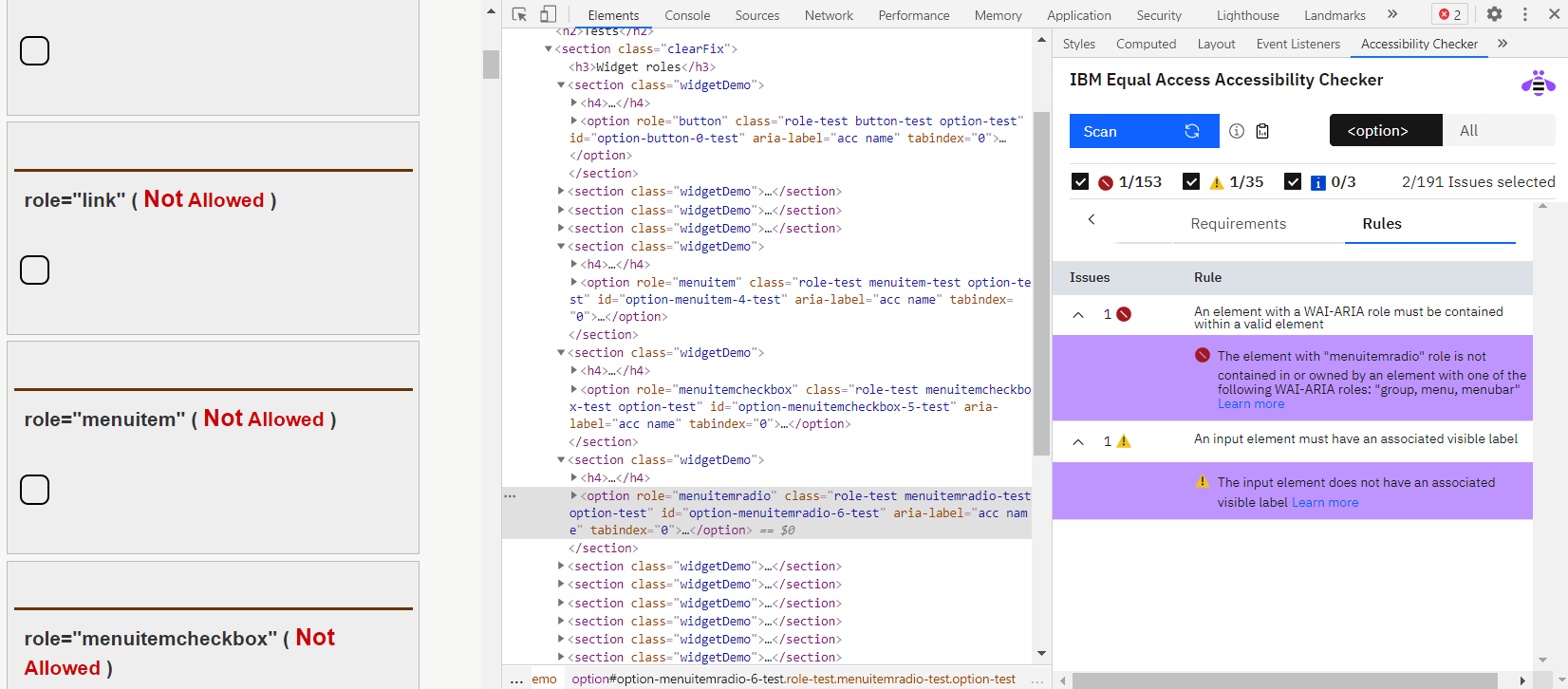 - note that menuitem, menuitemradio, option, and separator are not flagged as invalid roles on option, but they should be.