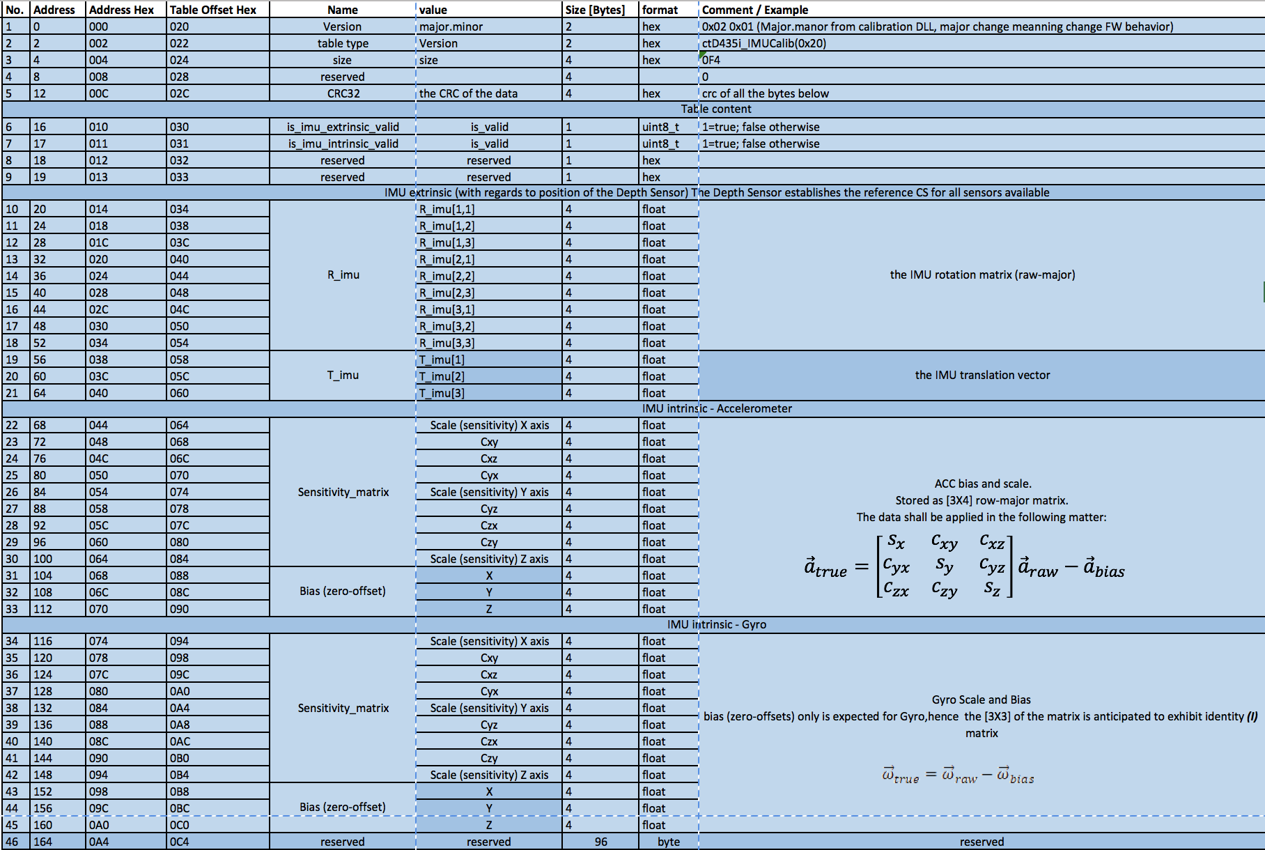This specific table is completely ignored by the firmware. If the calibration tool uses above table format, librealsense will automatically pick-up the values and apply them to the raw IMU data. In this case the calibration tool is this python script with linear regression along 6 known orientations.