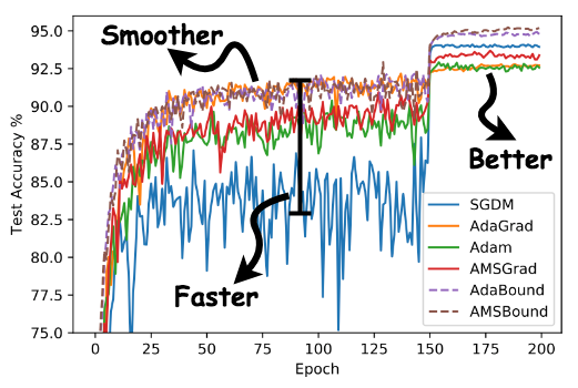 Despite of its robust performance, we still have to state that, there is no silver bullet. It does not mean that you will be free from tuning hyperparameters once using AdaBound. The performance of a model depends on so many things including the task, the model structure, the distribution of data, and etc. You still need to decide what hyperparameters to use based on your specific situation, but you may probably use much less time than before!