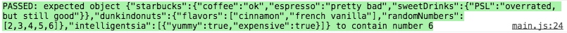 Passed test indicates that data (can be an object or array) contains comparison anywhere in its structure. This works for complex arrays and objects with nested data.