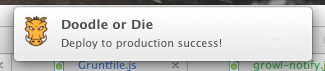If you are using OS X 10.8 Mountain Lion or newer a notification system is built in, but Apple does not provide a notification API that Node can access. Only code written in Objective C and signed in XCode can access it. This is not very friendly for Node users so we are using the tiny signed MIT-licensed native application Terminal Notifier from Eloy Durán. I've changed the default icon which is owned by Apple to the Grunt logo.