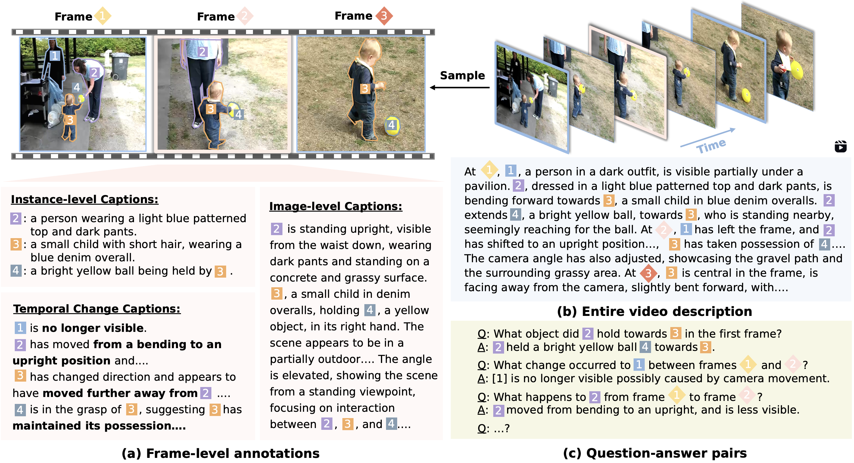 - 207k frame-level descriptions (51k images, 156k video frames) (each frame-level description includes captions of 1)individual instances, 2)the entire image, and 3)the temporal changes.)
