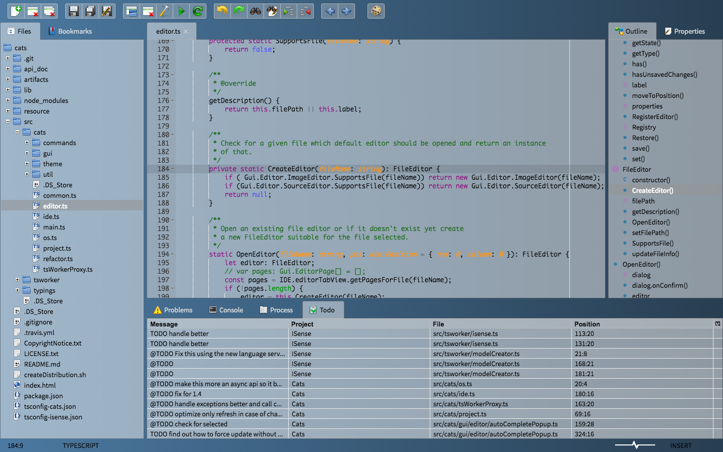 CATS is an IDE for TypeScript and Web developers. CATS is open source software released under the Apache 2.0 license and runs on Linux, Windows and OS X. CATS itself is also written in TypeScript, so you can easily customize it to your needs if required.