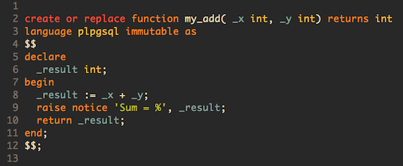 Code between $pgsql$ or $$ pairs is treated as PL/pgSQL and highlighted