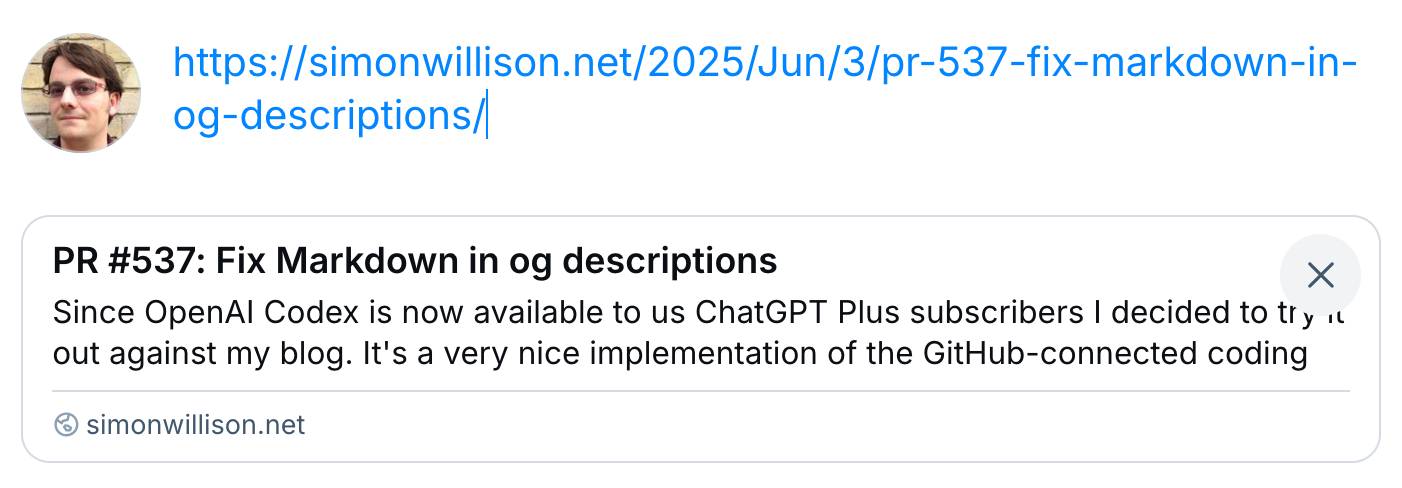 They serve meta property="og:description" content=" tags on the page, but those tags include that raw Markdown which looks bad on social media previews.