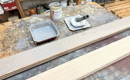 《オスモカラー塗装フローリングとDEESAWATモザイクフローリングはアルブルインク》 アルブルインクのサイト、YouTube、インスタグラム 春頃に問い合わせがありサンプルを送っていた物件を担当する業者さんから注文が入りました。 この現場はフローリングもサンプルを送っていたのですが、どうも新建材メーカー品に決定したらしく塗装仕上げパネリングのみ注文を頂きました。 ありがとうございます。 約60平米リビングルームの天井に採用いただいたようですが、広いリビングルームですね。 オスモカラーウッドワッ…