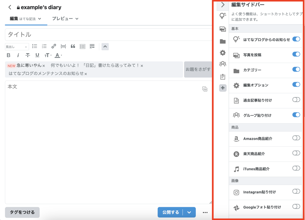 はてなブログの記事編集画面には、右側に 編集サイドバー があります。編集サイドバーでは、記事に写真や画像を貼り付けたり、カテゴリーを設定したりできます。また、予約投稿をしたりできます。