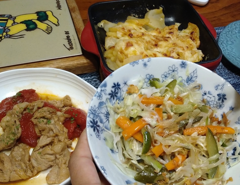 向かって右は炒めきゅうり(←わが家では普通)を入れたゴマドレサラダ