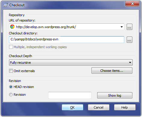チェックアウトウィンドウが表示されます。URL リポジトリ 欄に wordpress.org SVN リポジトリの URL を入力します。