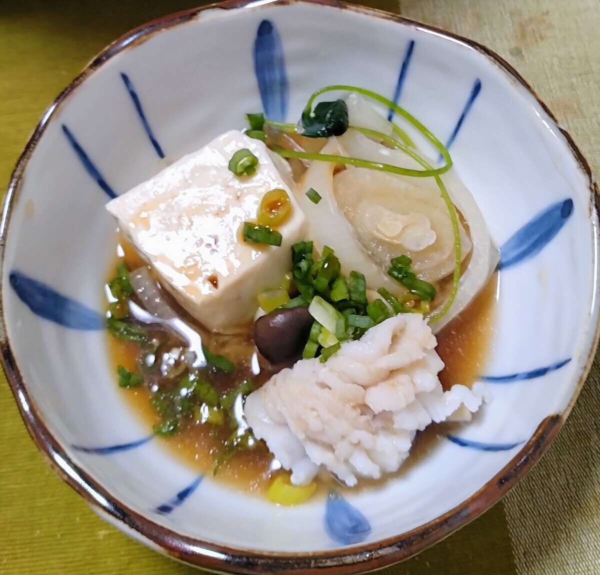 骨切りした鱧、豆腐、平茸(本来は松茸が望ましい)、三つ葉、玉葱、葛切りです。