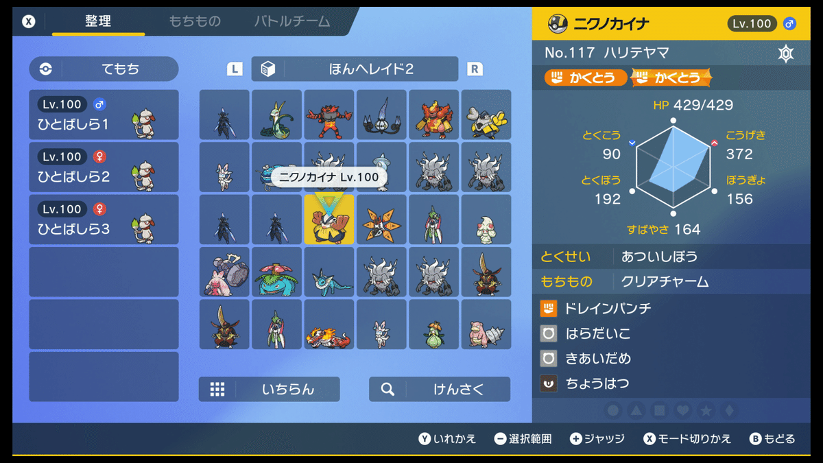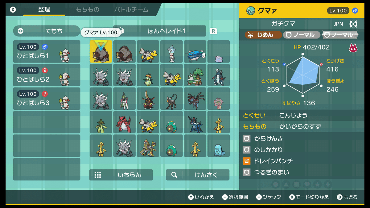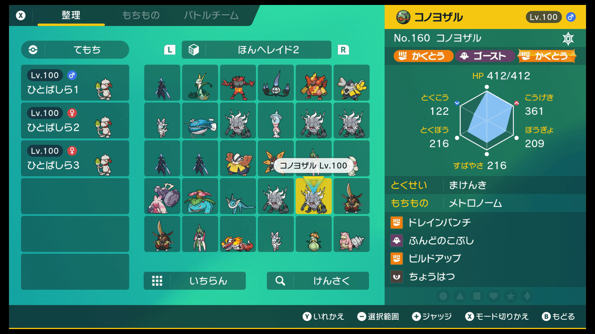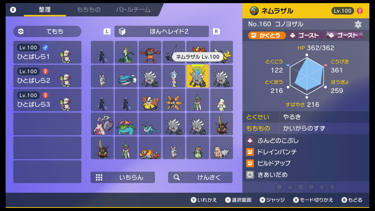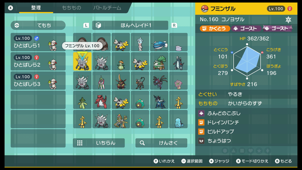 本編レイド最強格の1体であり、負けん気と気合溜めを使う脳筋猿。DLC配信前はボディプレス型による攻略が主流だったがドダイトスの入国により一転し、この子だけで全タイプ攻略できるようになった。