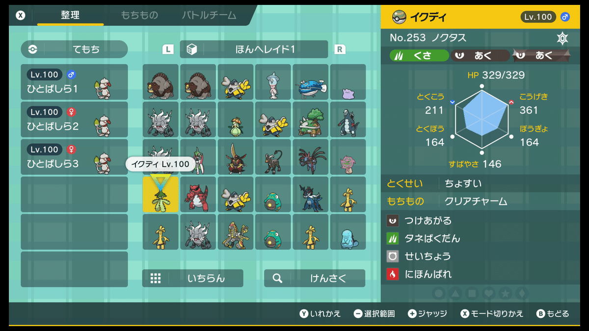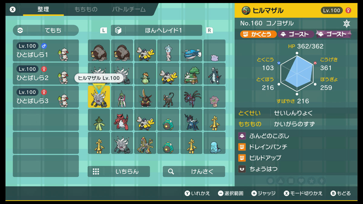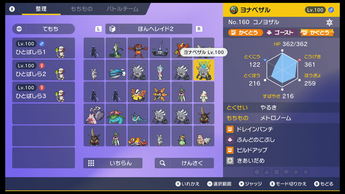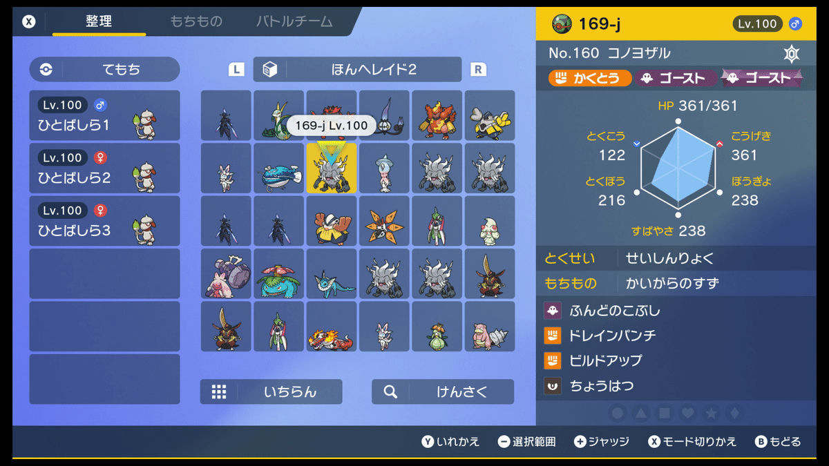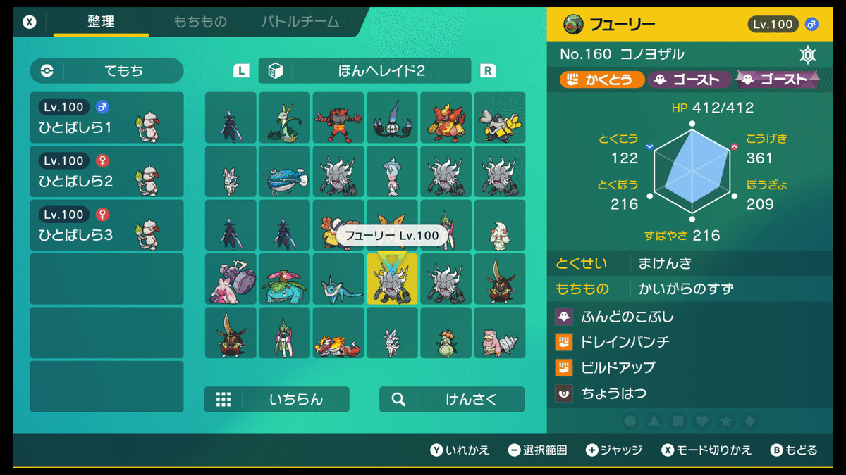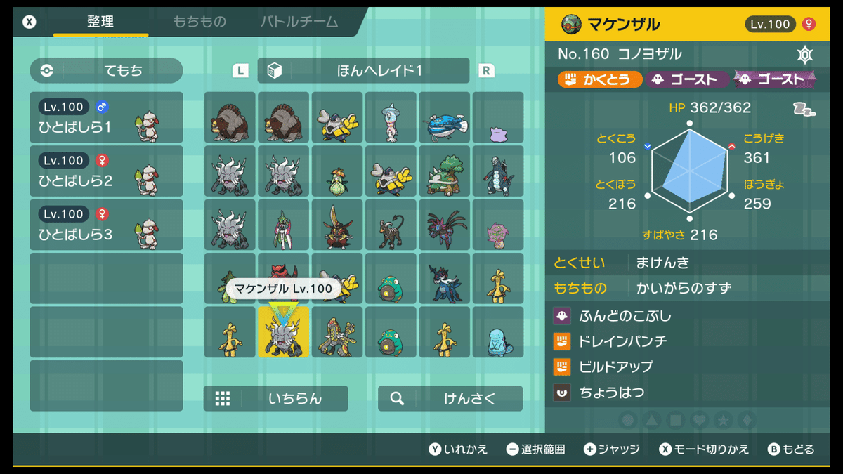 本編レイド最強格の1体であり、負けん気と気合溜めを使う脳筋猿。DLC配信前はボディプレス型による攻略が主流だったがドダイトスの入国により一転し、この子だけで全タイプ攻略できるようになった。