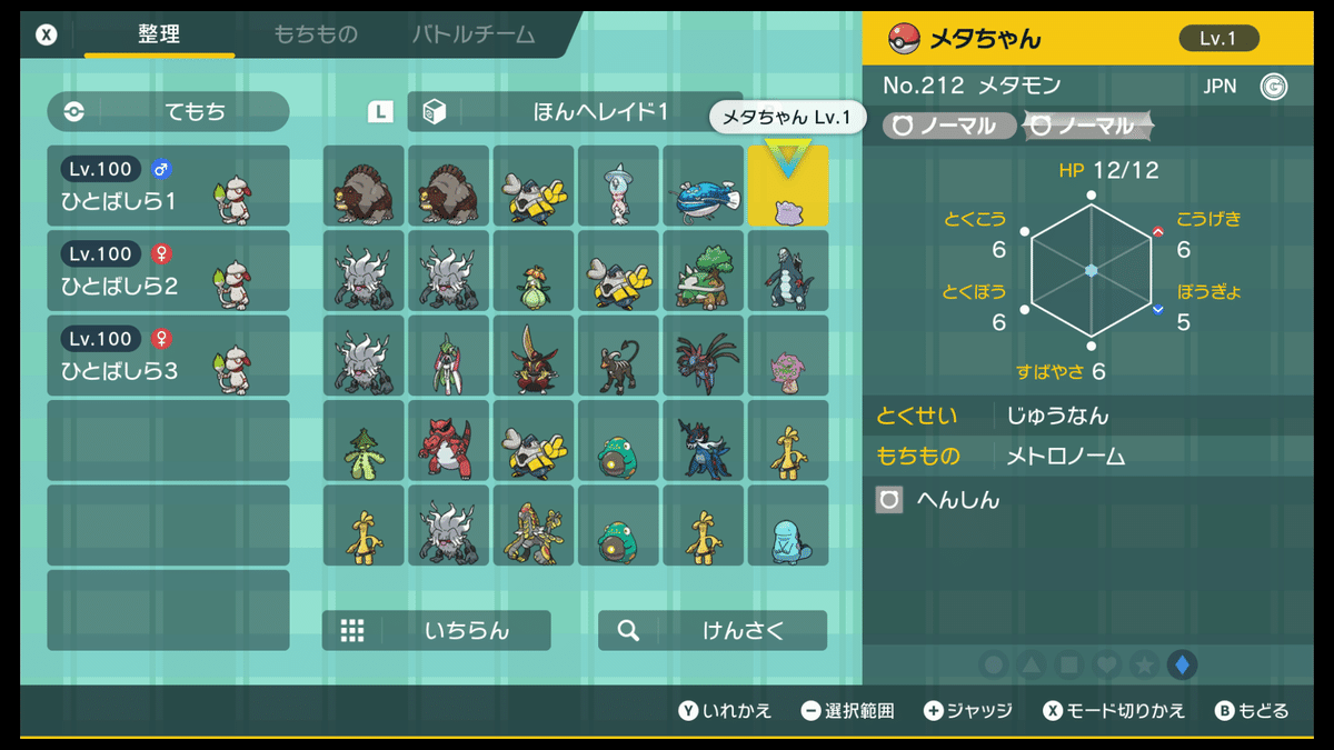 自分だけの最強レイドポケモンを実装できるポケモン。ホストが選出するポケモンがレベル1の場合において参加するnpcのポケモンのレベルが80固定になる仕様を利用し、レイドボスのメタモンが(HPを除く)レベル1相当のステータスにしたうえで、高レベルのnpcのポケモンで殴らせて攻略するというかなり異質な方法となる。