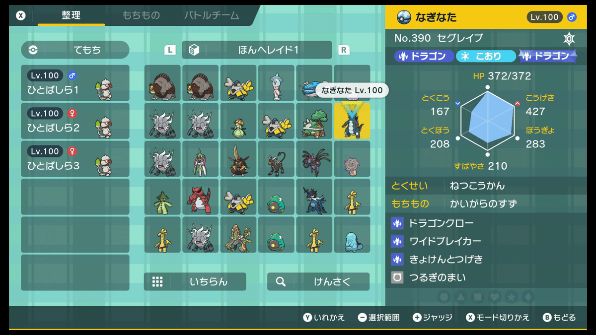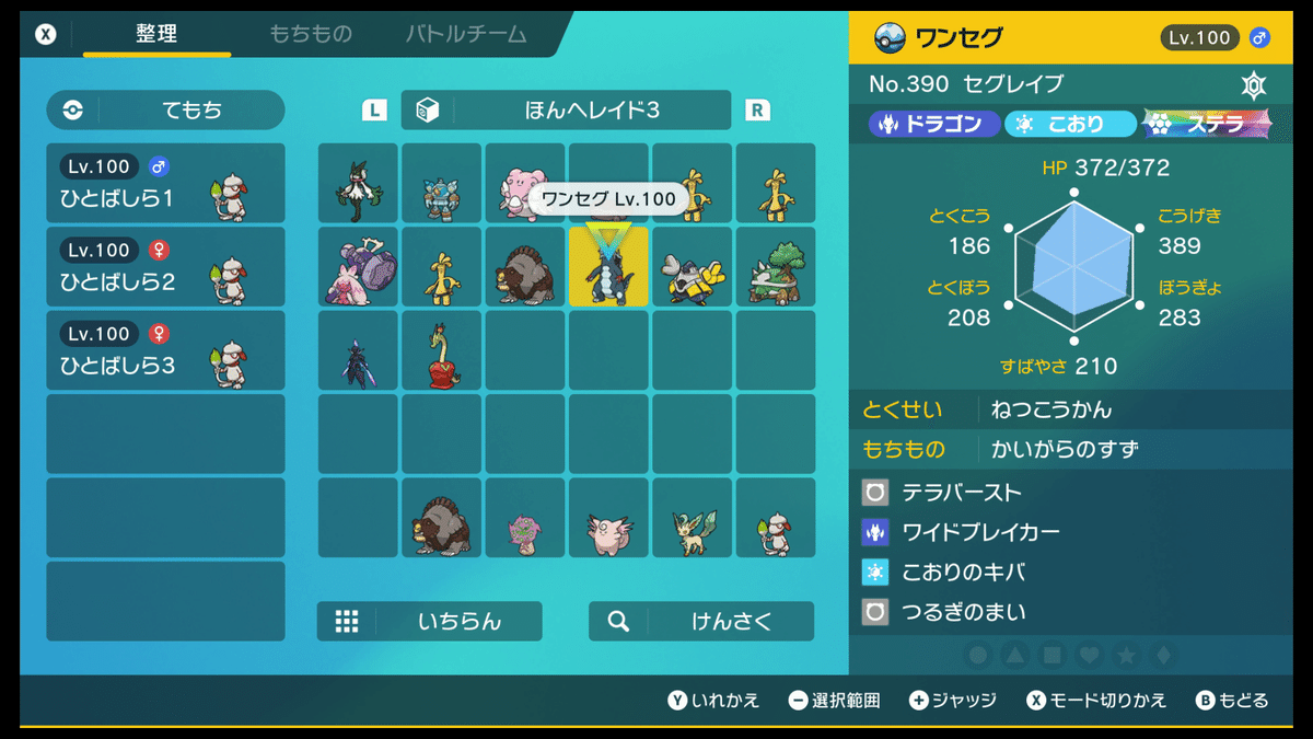 砕ける鎧に着目すればそこまで火力には困らない相手。ただし鬼火の対策が必要となる。これらの対策を同時にできるポケモンは根性持ちアタッカー、炎タイプの物理アタッカー、熱交換セグレイブ辺りがメジャーとなり、今回はセグレイブを採用。ステラテラスを採用しているため無念の剣を等倍で受けることになるが代わりにAを1段階上昇させられる。耐久に関してはフェアリーテラス以外はワイドブレイカーで対応できるため特に問題ない。
