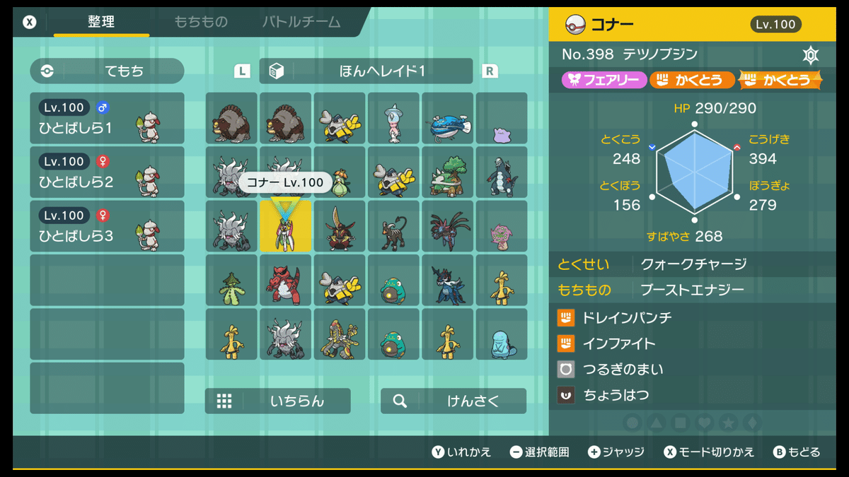 テツノカイナ:腹太鼓をしてドレインパンチで攻撃。バリア展開後は応援込みステラテラバーストで攻撃。破壊後の攻撃はどちらでもいい。なお強化解除後の積み直しも腹太鼓でいい。