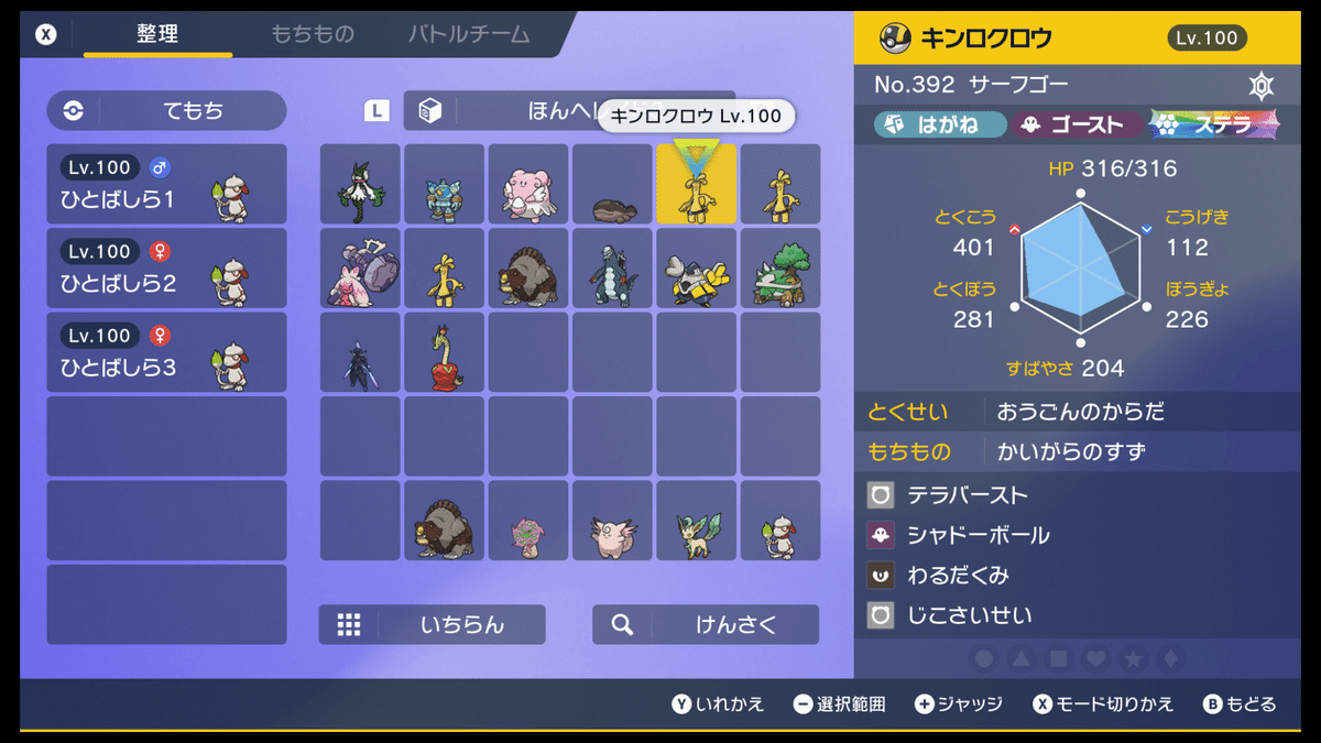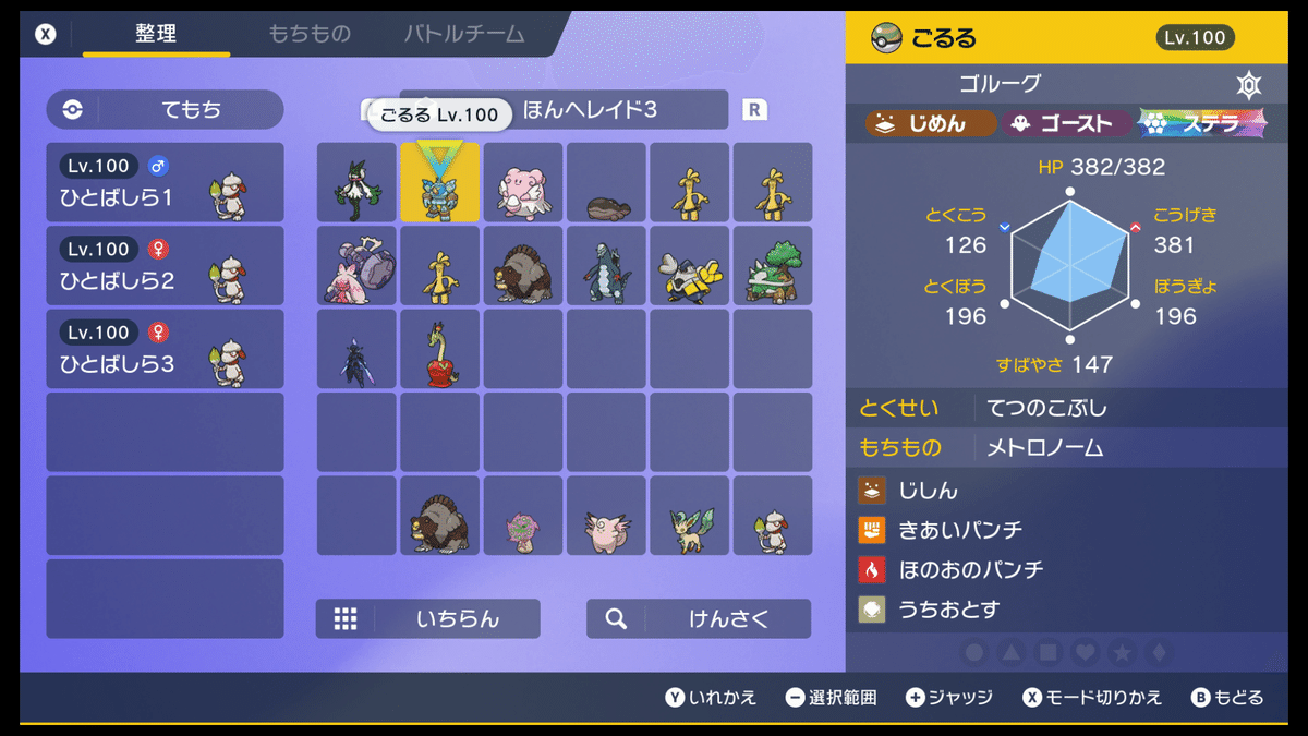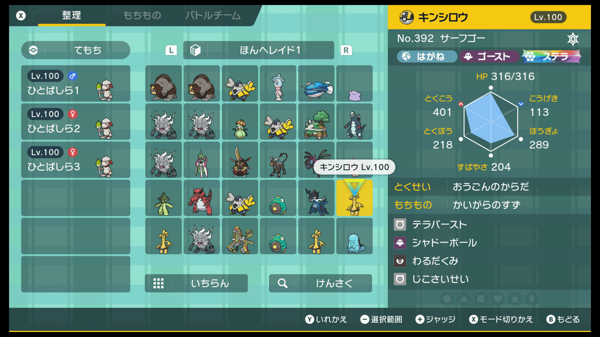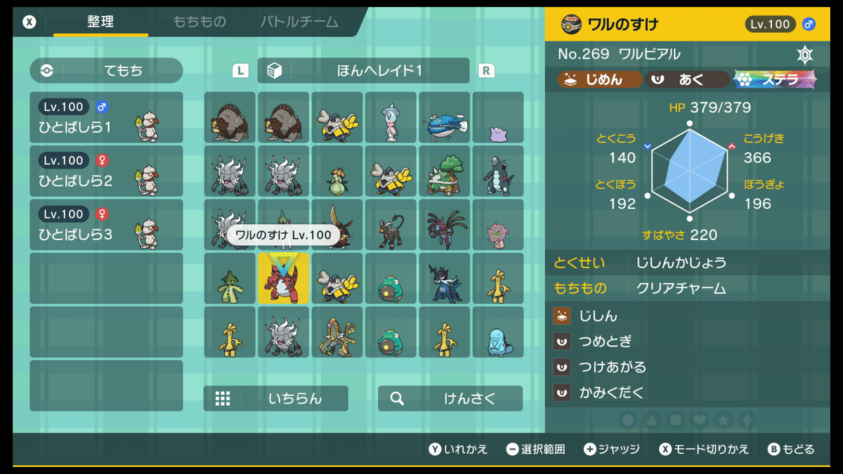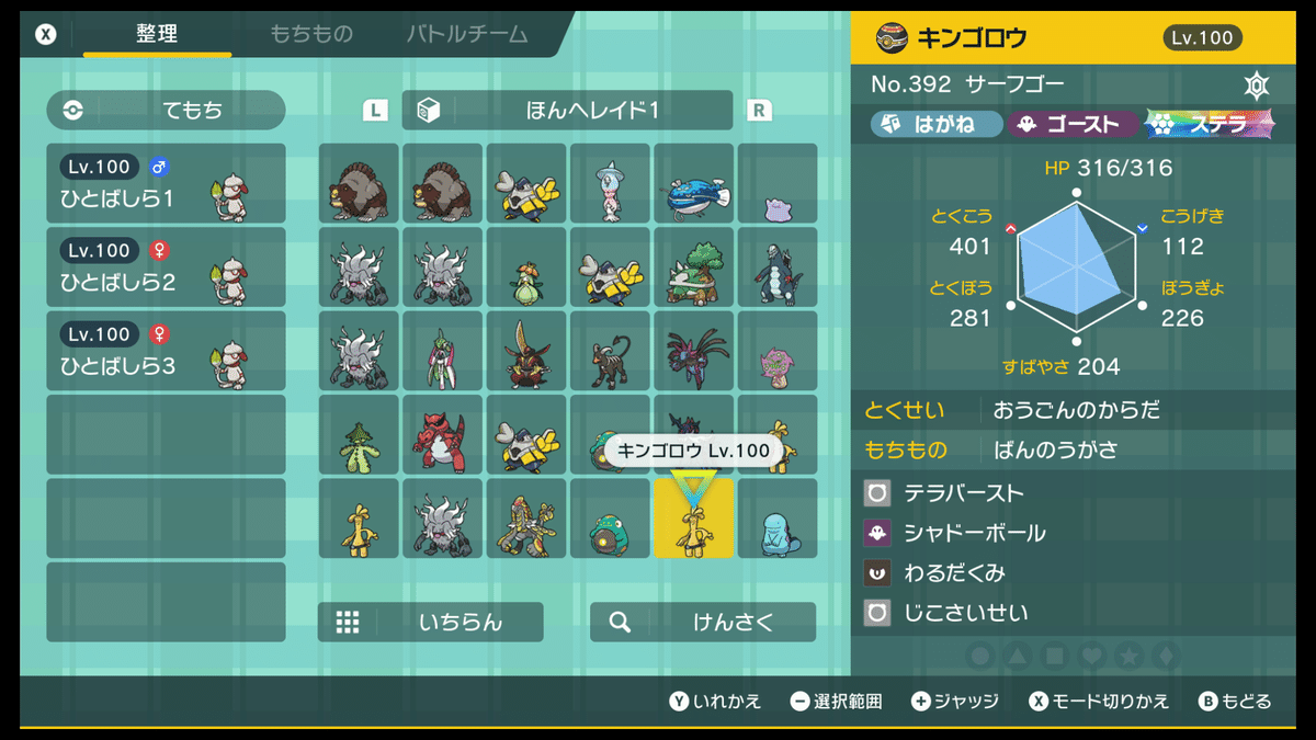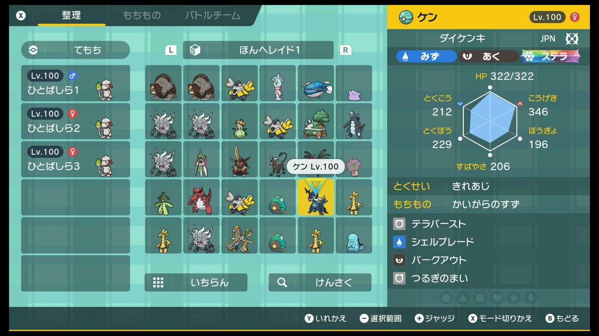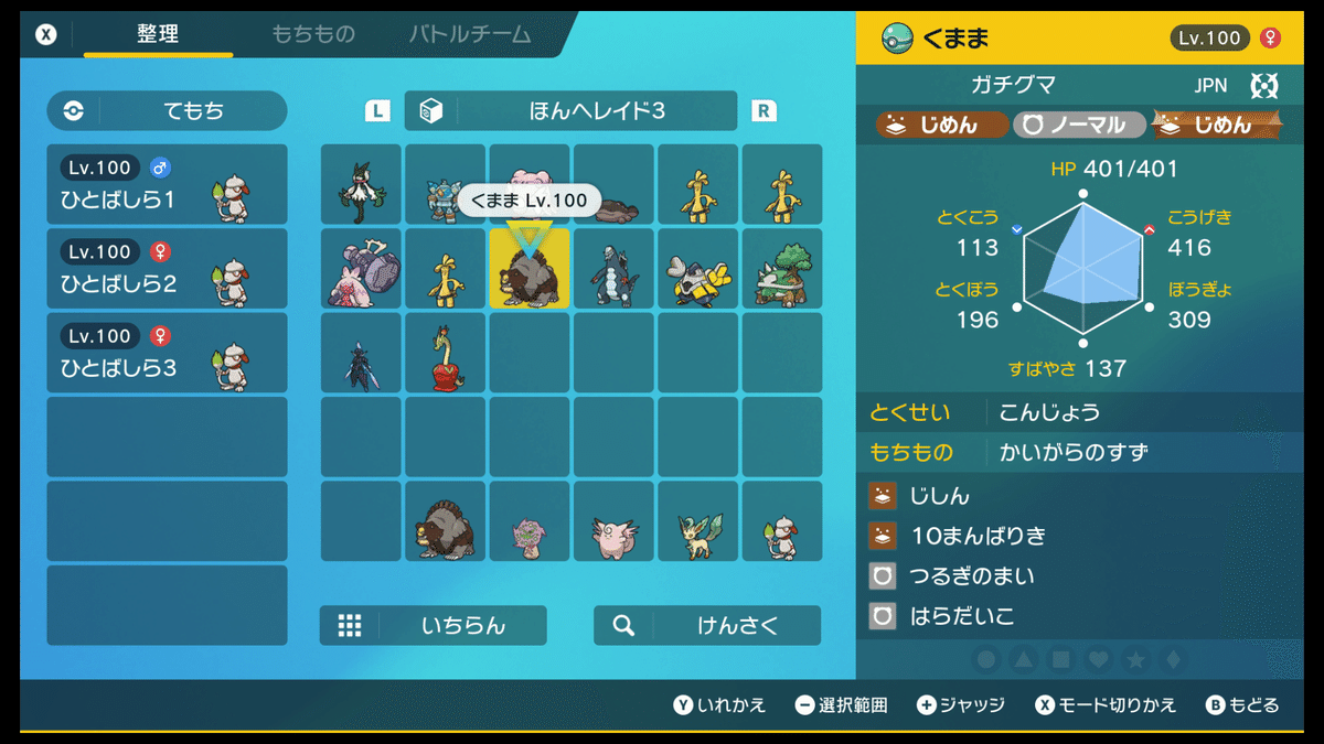 以前はステラテラスを採用していたもののガチグマの根性空元気を持ってしてもバリア展開時の火力減少がカバーできなかったためノーマル、地面と分ける形となっている。テラス時において耐久は下がるがそれ以上に火力減衰がなくなるためあまり問題にならない。但し強化解除後の積み直しにおいて、特に地面テラス時では火傷のダメージが響いて上手く剣舞が使えない場合があるためエールを使って回復する必要が出てくる。