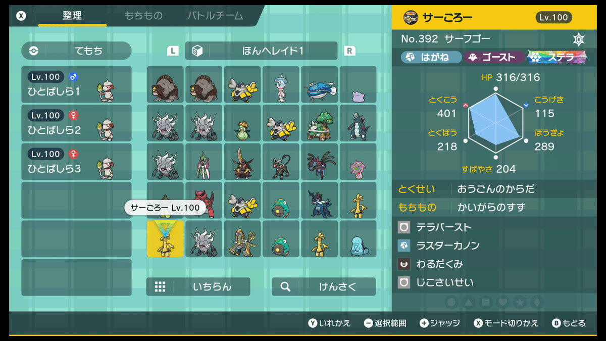 テラスタル回収回数がやたら多く、しかも破壊光線持ち。しかしサーフゴーであれば攻撃技は半減パワージェムに誘導できるため採用。もしノーマル半減タイプでない場合は連続して破壊光線を打たれるため他のポケモン選出する際は要注意。