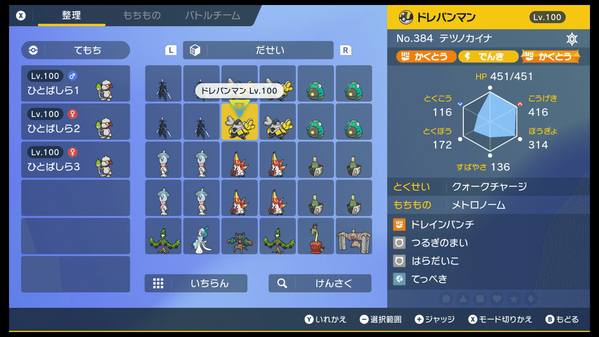 テツノカイナ:腹太鼓⇒ドレインパンチ⇒応援(いけいけドンドン)⇒インファイト