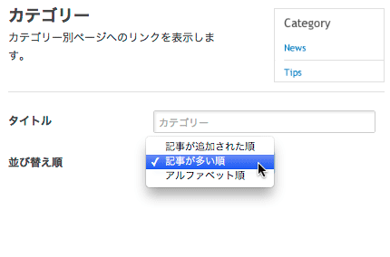 サイドバーに表示できる「カテゴリー」モジュールで、カテゴリーの表示順を次の3つから選択できるようにしました。