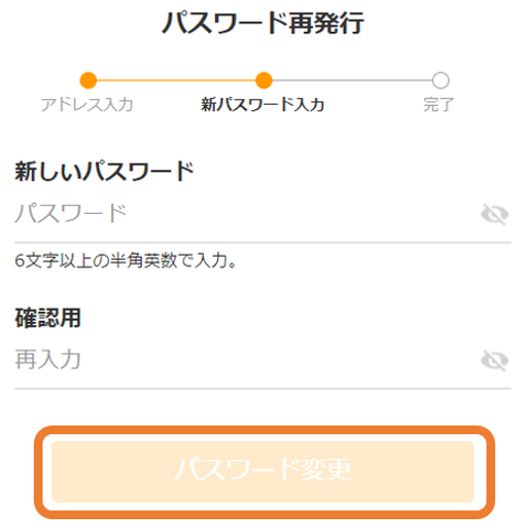 ②登録中のメールアドレスに届いたメールに記載されているURLをタップし、新しいパスワードを入力して「パスワード変更」ボタンをタップしてください。(メール到着から24時間以上経過した場合は、再度①からはじめてください)