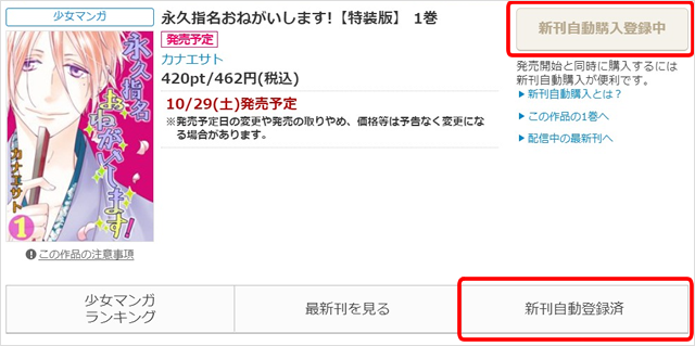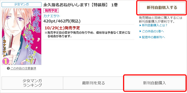 ※作品が発売されてから新刊自動購入が完了するまで30分程度かかる場合があります。 - 対象作品を先に購入された場合には、新刊自動購入は行いません。