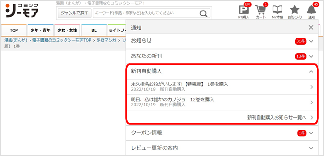 漫画(まんが)・電子書籍のコミックシーモアTOPヘルプTOP新刊を自動で購入する