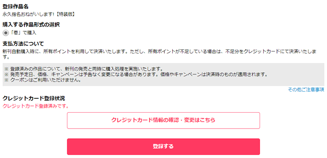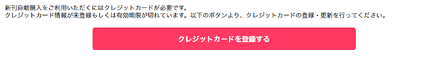 - ・ご登録いただいているクレジットカードにて決済処理ができなかった場合は、新刊自動購入は行いません。
