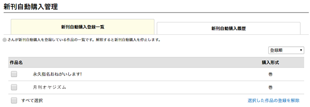 - 新刊自動購入対象となるのは、登録日の翌日以降の新刊発売日分からとなります。登録日以前に発売開始された既刊は、対象に含まれません。
