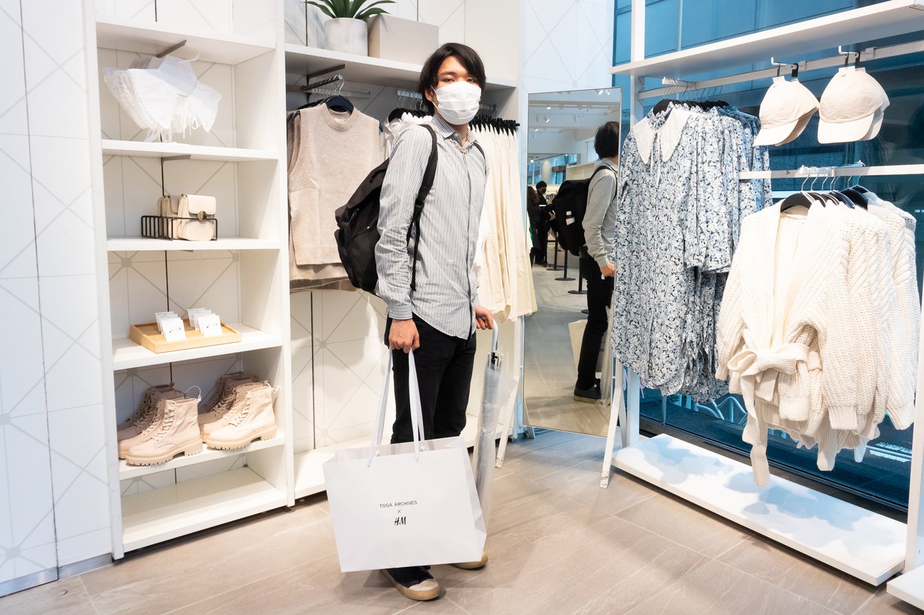 話題のスポットで今日1番〇〇した人に話を聞く「今日の1番さん」。今回は、古田泰子が手掛ける「トーガ(TOGA)」と「H&M」のコラボレーションコレクション編。9月2日の今日、世界各地の一部店舗と公式サイトで販売を開始しました。オンラインストアでは、発売の約1時間前からサイトにアクセスしづらい状態が続き、販売開始から約10分で全アイテムが完売。店頭では、10時の発売開始から1時間をH&Mメンバーの中から抽選で当選した人の先行ショッピング時間として設け、渋谷店では30分でメンズのトレンチコートや、ウィメンズのバルーンスリーブセーターなどが在庫切れとなりました。先行ショッピング当選組の中から最初に取材に応じてくれた「今日の1番さん」に話を聞きました。
