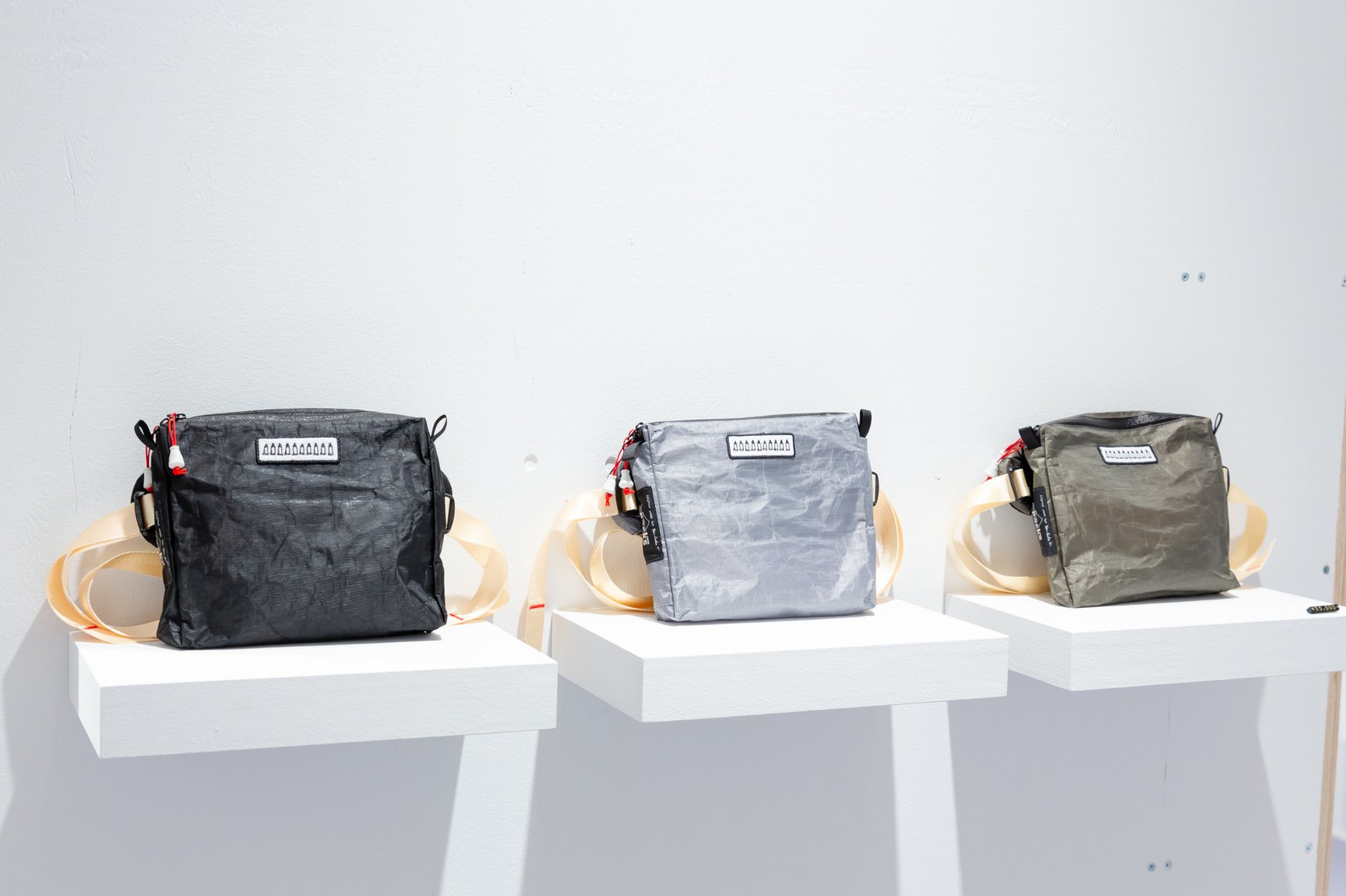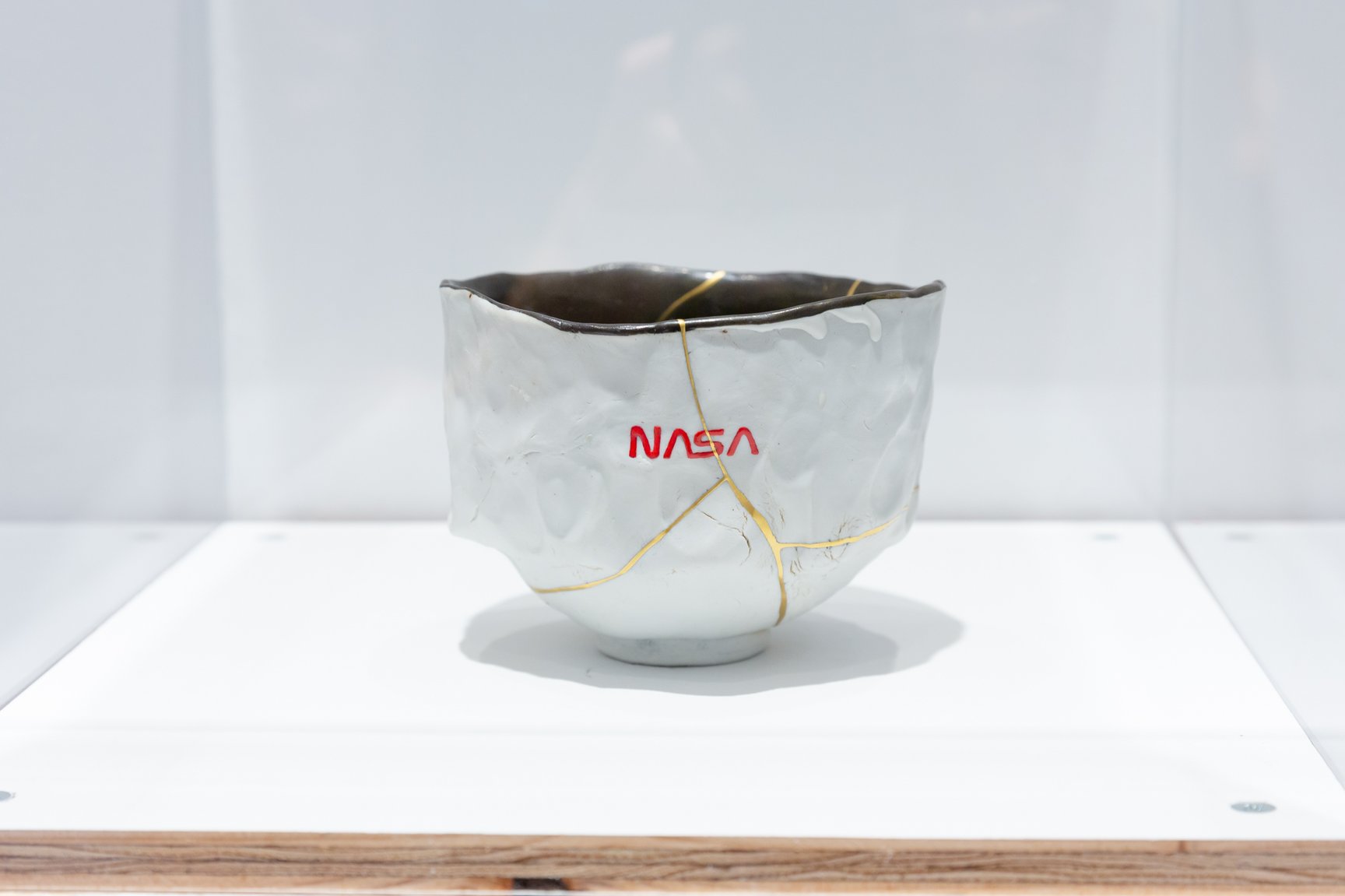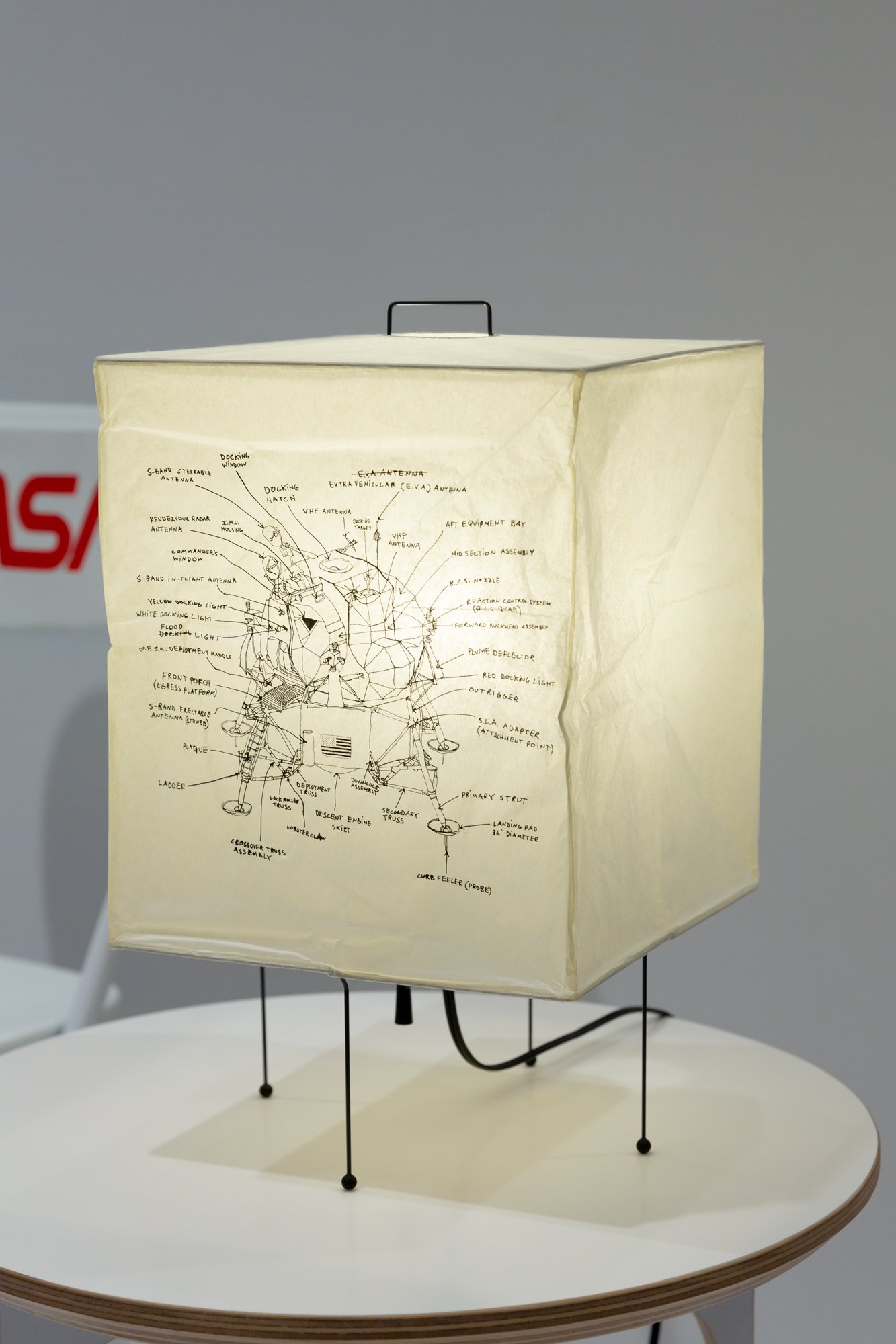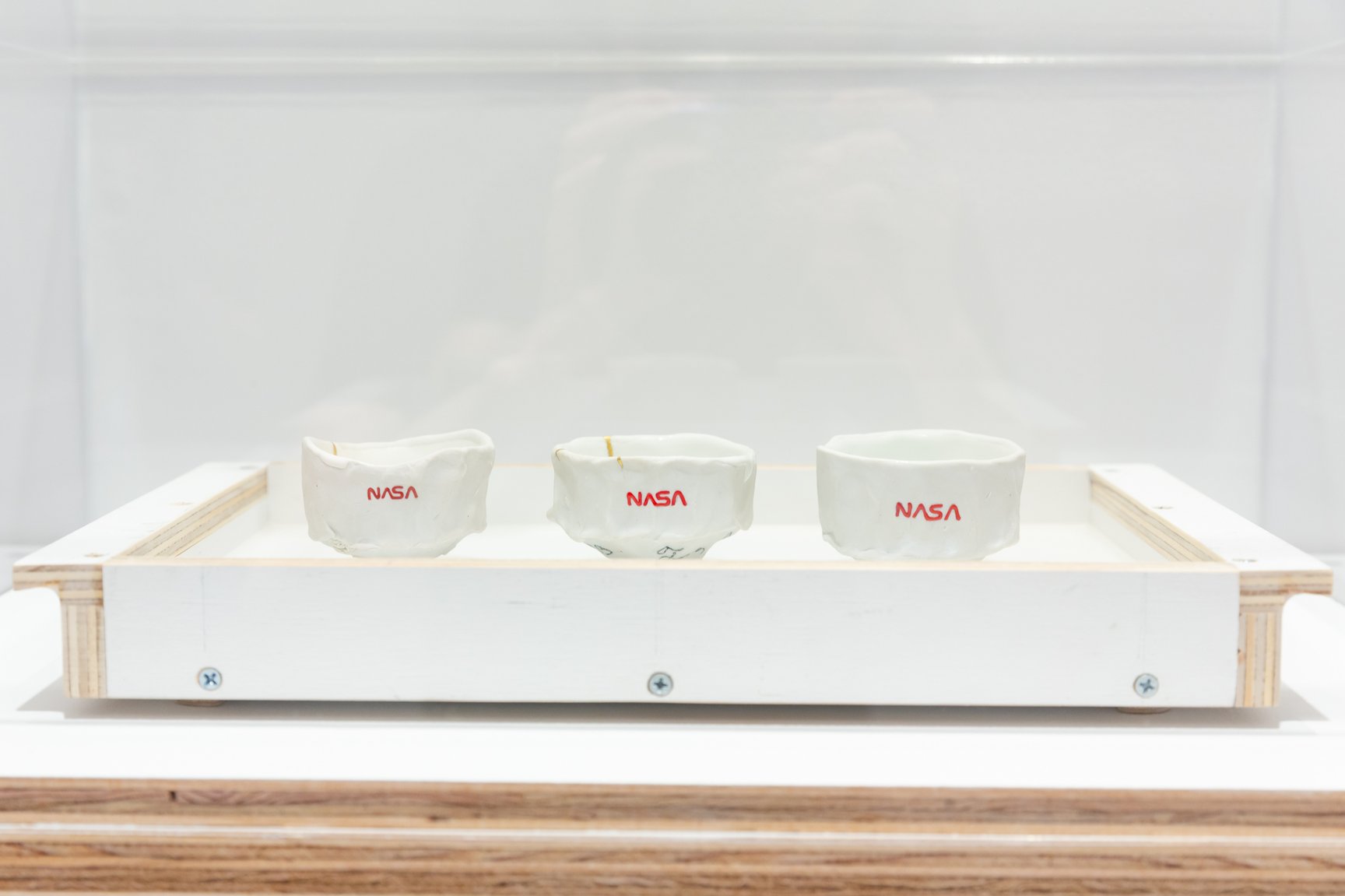 会場では、東京オペラシティ アートギャラリーで昨年開催した個展「ティーセレモニー(Tea Ceremony)」で発表した映像作品を紹介するほか、「アート」「プロダクト」「家具」の3つのジャンルの作品を展示販売。伊勢丹新宿店限定のTシャツをはじめ、世界先行発売の太陽系のグラフィックを落とし込んだTシャツや、数種類の実寸大のネジの絵をプリントしたロングスリーブTシャツ、防水バッグ「Funny Packs」の新色、展覧会の情報を掲載したZINEなどが揃う。また、盤面のマグネットによって無重力空間でプレイできるチェスや、サックスを代表する作品の茶碗、お盆とセットの猪口3点、版画とセットになった宇宙でもできる塗り絵のスペースハードウェアなど過去の作品も豊富に用意。人気のNASAチェアは会期中に抽選販売を行う予定で、詳細は11月初旬に発表する。