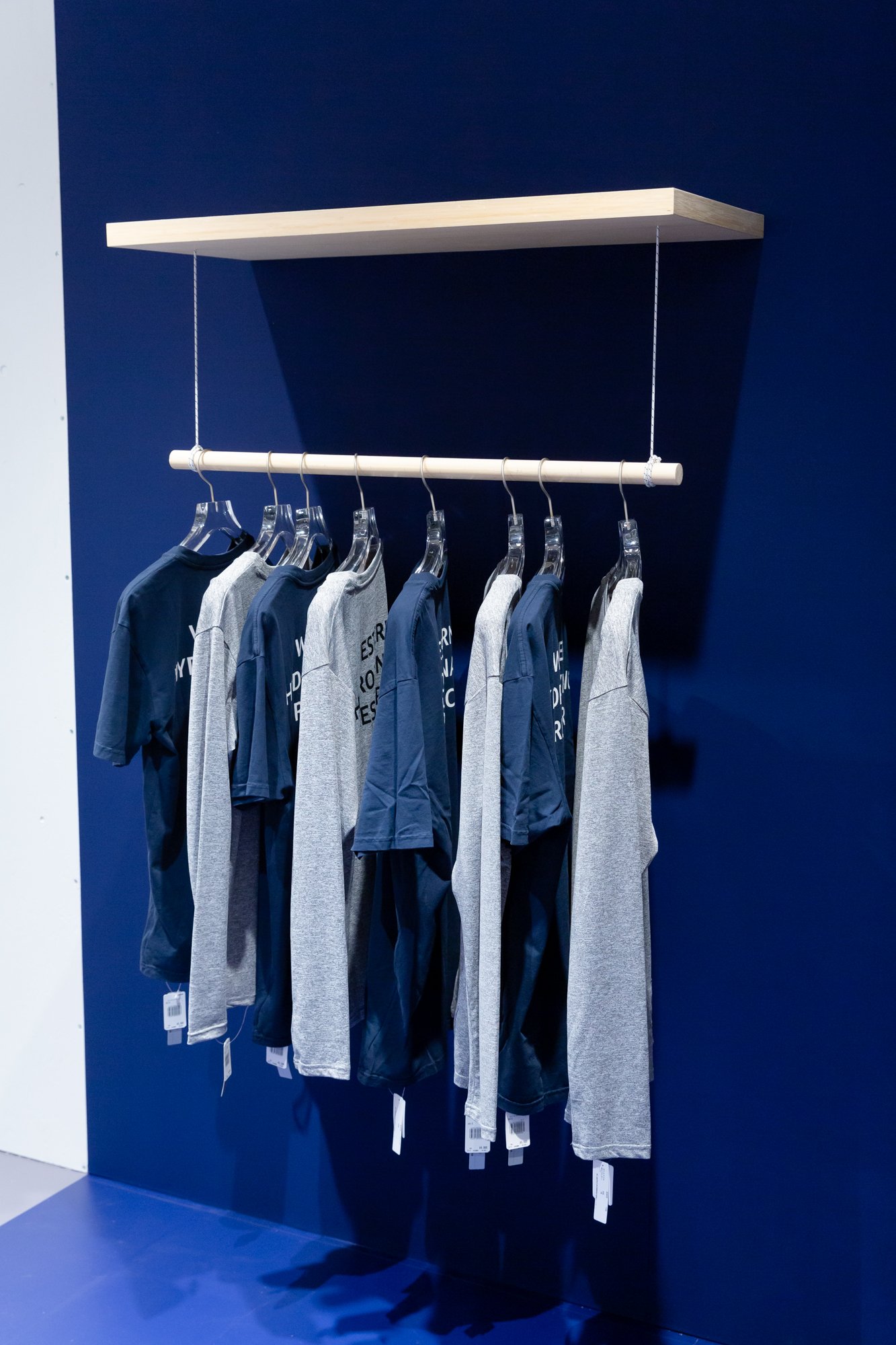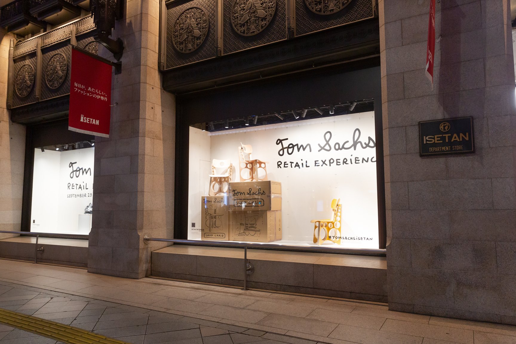 同展は、アーティストとしての最初の仕事が「バーニーズ・ニューヨーク(Barneys New York)」のウィンドウディスプレイの制作だったことからサックスにとって関心が高い「小売」にフォーカス。「購入体験も作品」をテーマに掲げ、会場の内装デザインをはじめ、10月13日まで展示している伊勢丹新宿店本館の計12のウィンドウディスプレイもサックスがデザインした。柱や壁には、チェアやテープルなどの家具作品で用いるプライウッドを使用している。