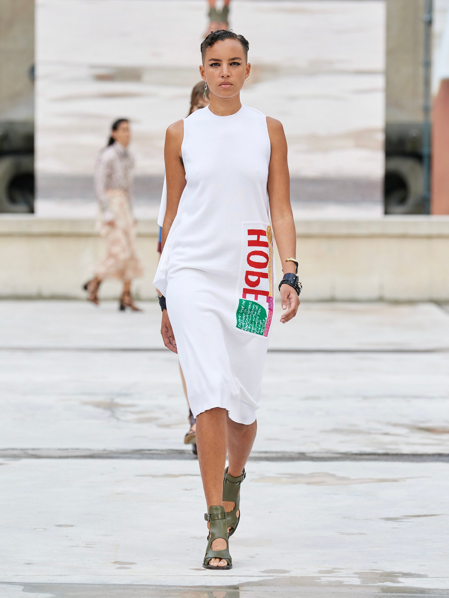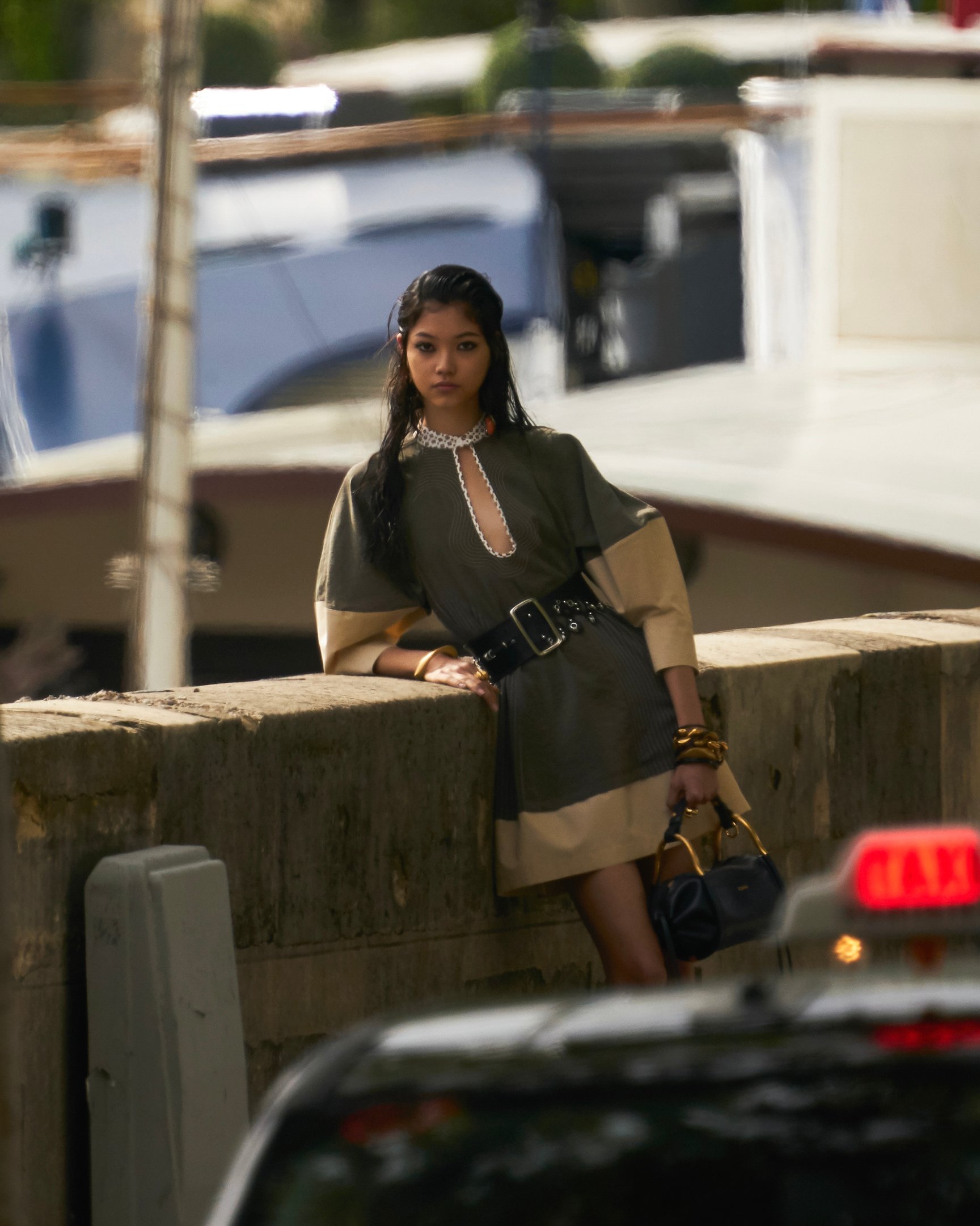 今シーズンのコレクションタイトルは「A SEASON IN HOPE」。目を引くTシャツやニット、ベルトにあしらわれた大胆なアートワークは、女性ならではの視点で世界情勢をシルクスクリーンアートに映し出したアメリカ人アーティスト コリータ・ケント(Corita Kent)による作品だ。褪せたネオンやブリーチニュートラル、暖かみのあるミネラルカラーを基調に、コリータの作品がプリントやニット、 織りといった手法を用いて、ウェアやアクセサリーのシルエットや表面を彩った。同氏の作品とクロエの数々のシンボルを融合させ、反抗的なフェミニニティの精神を表現したという。