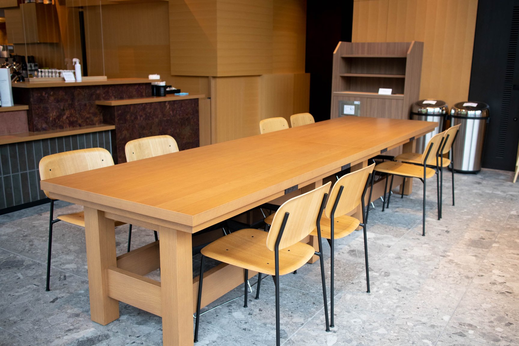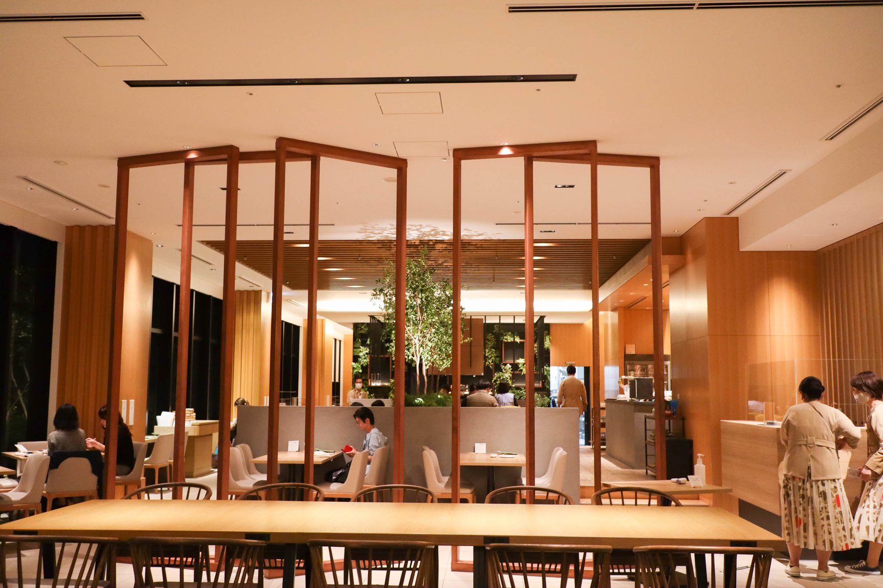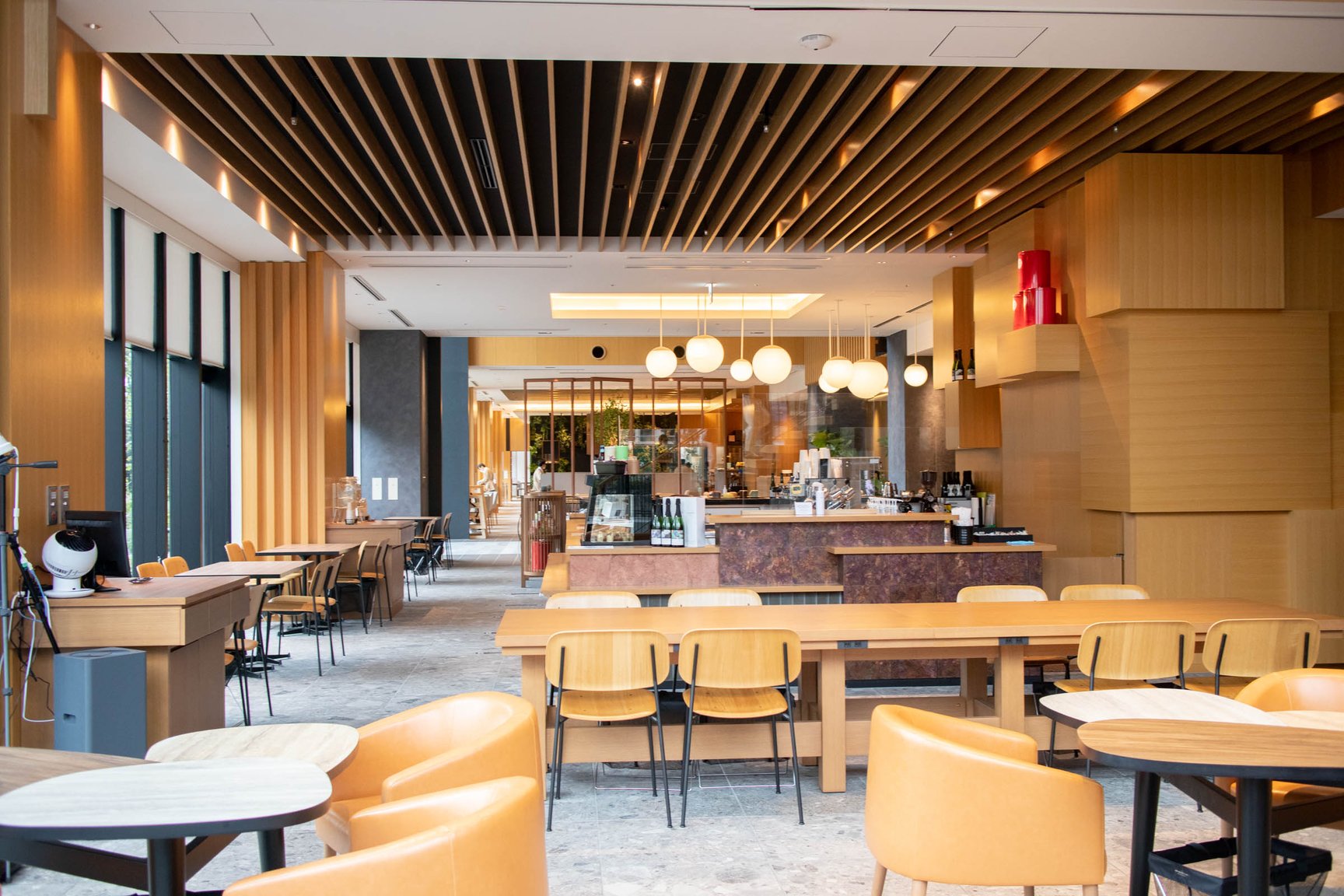 本館1階はレストランとカフェを併設。梅小路公園の景色を眺めることができるようガラス張りのスペースに仕上げた。レストランはブッフェ形式のブレックファストやランチをはじめ、ディナータイムでは環境に配慮しながら農作販売を行う企業「坂ノ途中」の協力のもと、野菜や肉の炭火焼料理などを提供。カフェではカウンターやテーブル席、テラス席を用意し、自家製のテリーヌや、京都河原町のカフェ「トラベリングコーヒー(TRAVELING COFFEE)」の牧野広志がポテルのためにオリジナルブレンドしたコーヒーを提供する。また、本館の屋上エリアには宿泊者が自由に利用可能なルーフトップテラスを備えており、京都タワーや京都の寺院を一望することができる。