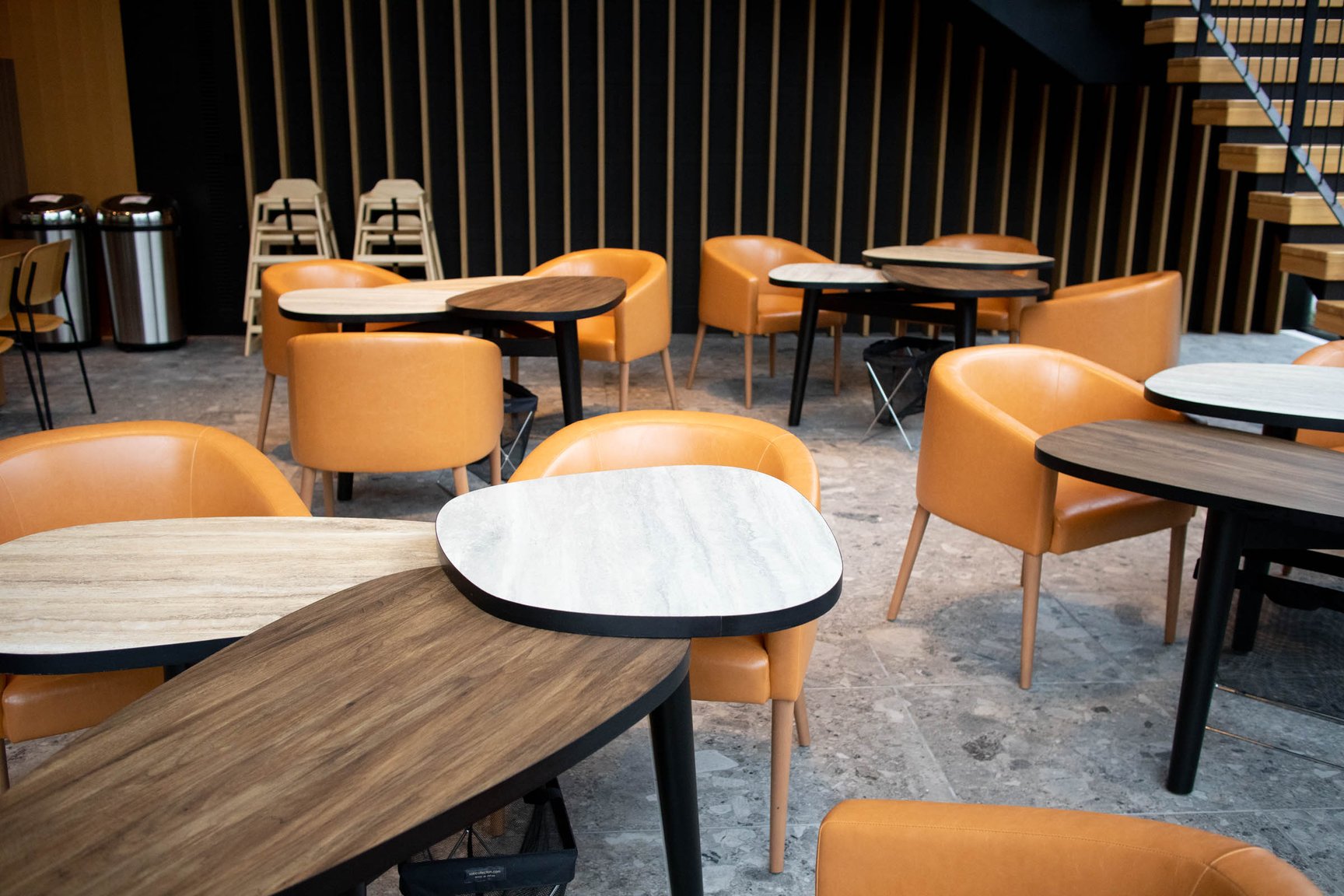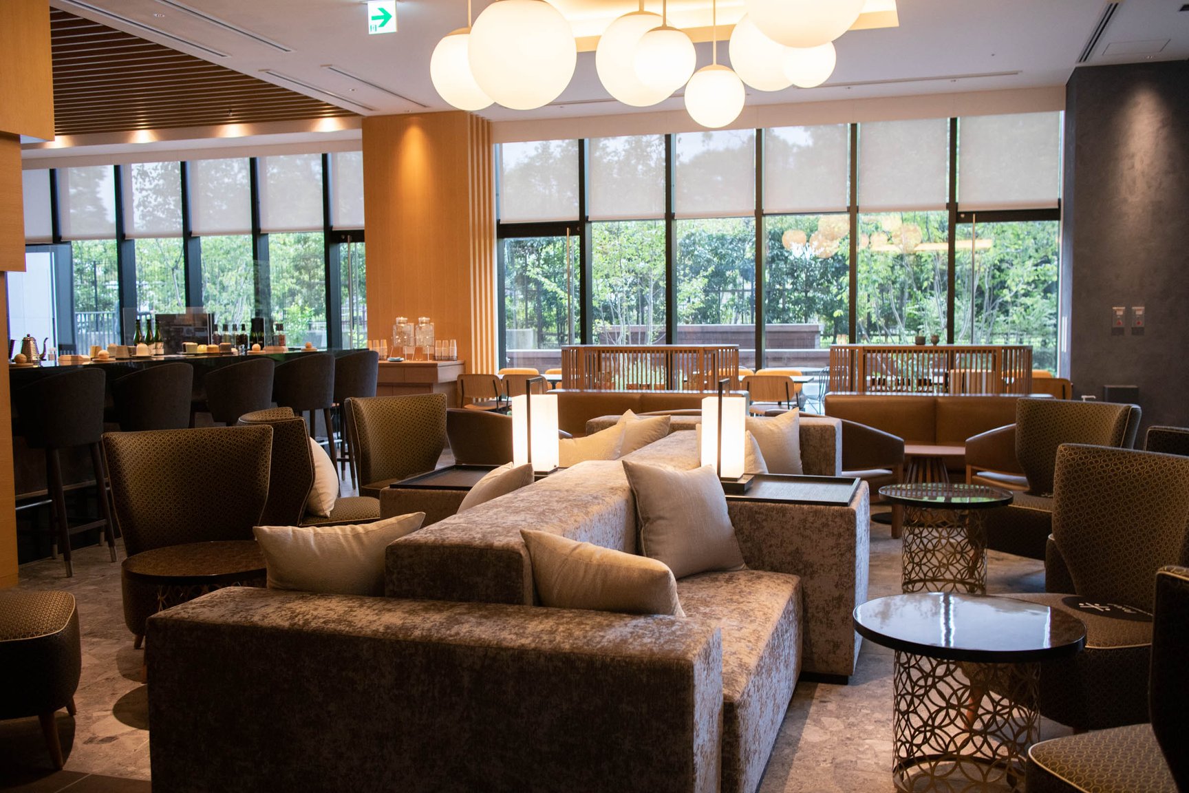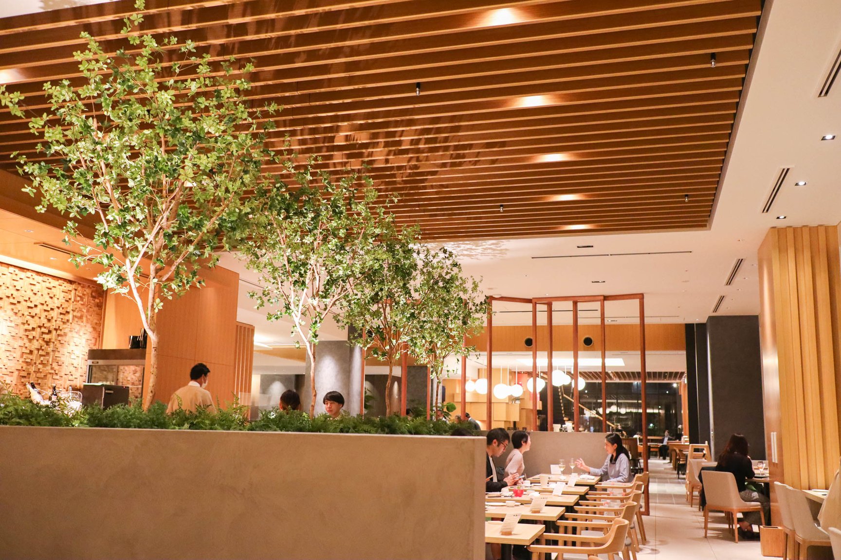本館1階はレストランとカフェを併設。梅小路公園の景色を眺めることができるようガラス張りのスペースに仕上げた。レストランはブッフェ形式のブレックファストやランチをはじめ、ディナータイムでは環境に配慮しながら農作販売を行う企業「坂ノ途中」の協力のもと、野菜や肉の炭火焼料理などを提供。カフェではカウンターやテーブル席、テラス席を用意し、自家製のテリーヌや、京都河原町のカフェ「トラベリングコーヒー(TRAVELING COFFEE)」の牧野広志がポテルのためにオリジナルブレンドしたコーヒーを提供する。また、本館の屋上エリアには宿泊者が自由に利用可能なルーフトップテラスを備えており、京都タワーや京都の寺院を一望することができる。