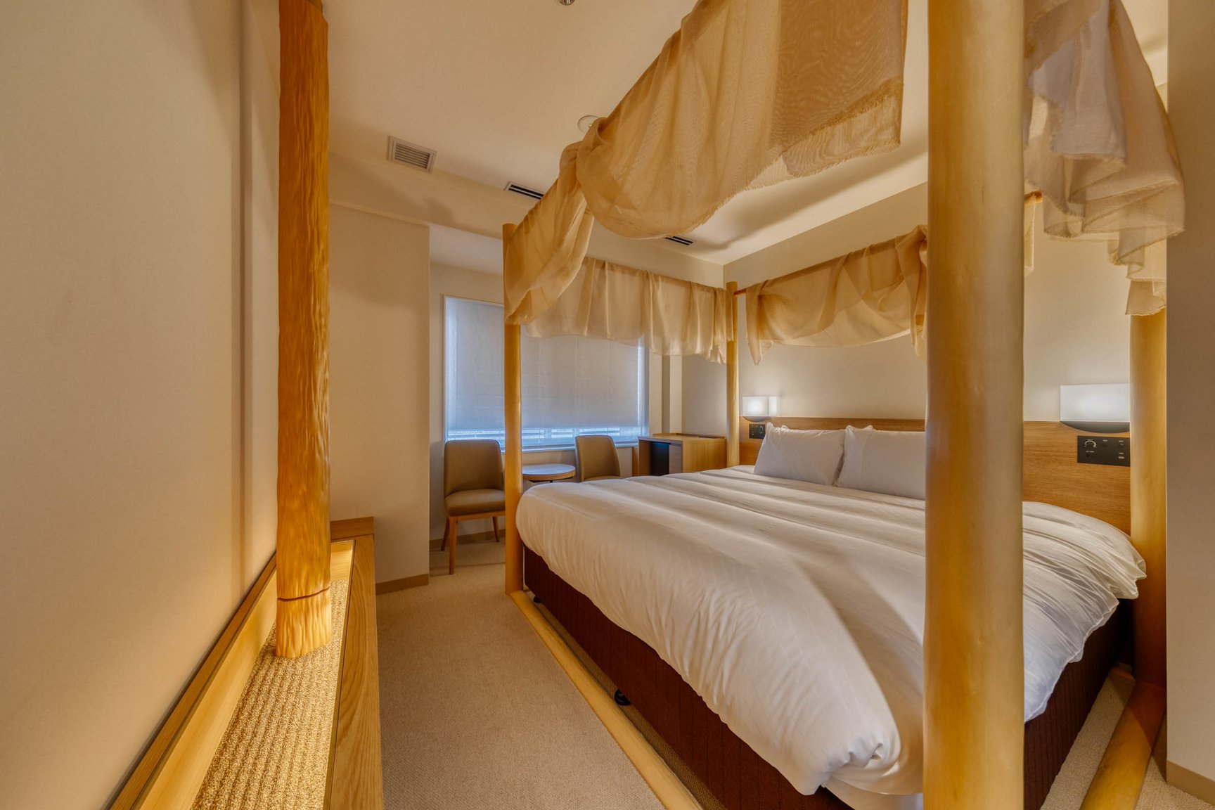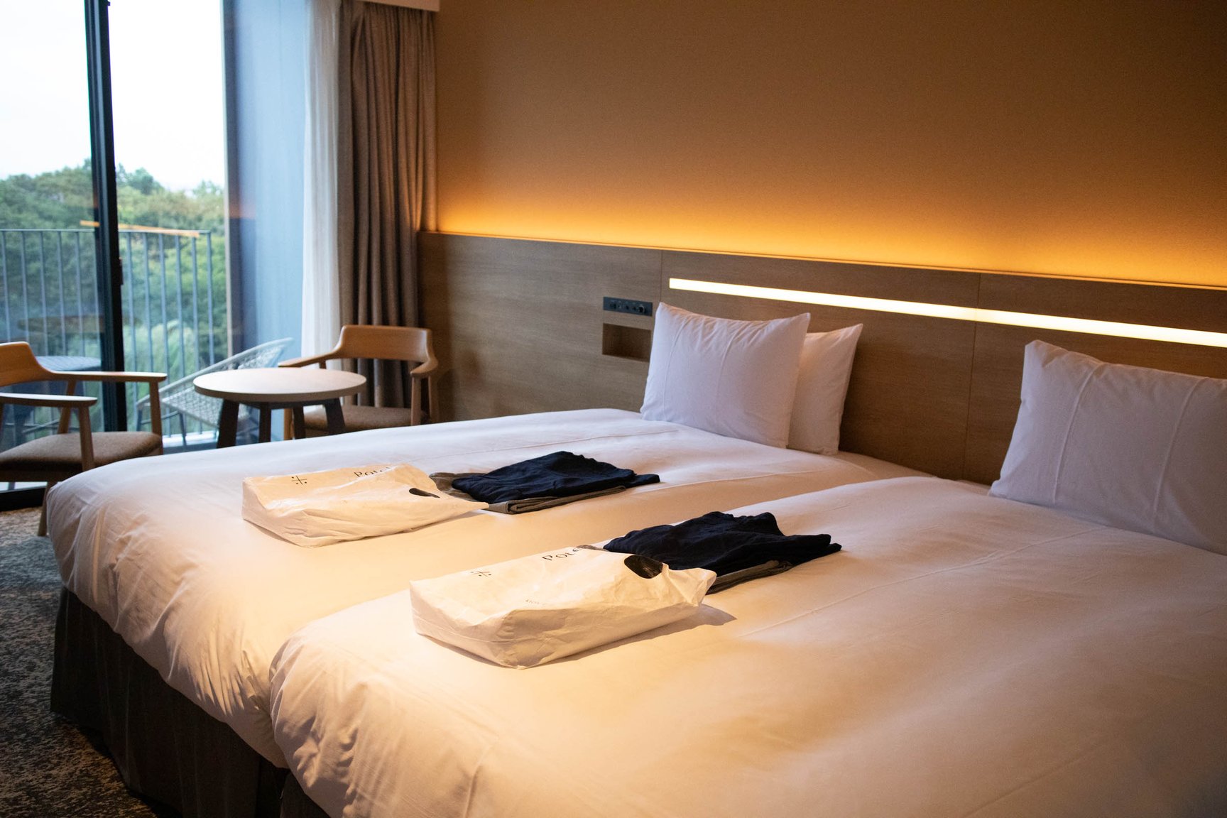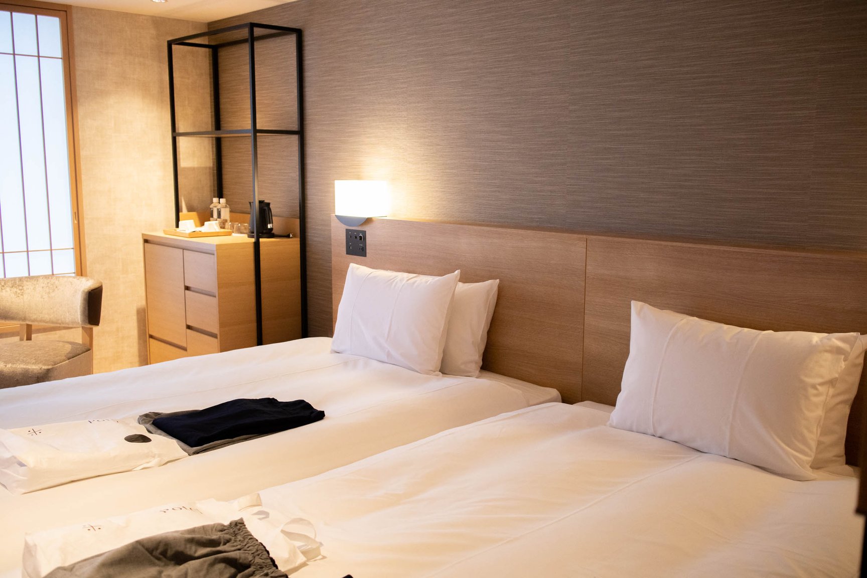 梅小路ポテル京都は、JR京都駅中央出口から徒歩15分の場所に位置し、JR西日本の京都梅小路社宅跡地に開業。地上5階建ての本棟と地上2階建ての別棟で構成し、客室は本棟の2〜5階に設ける。設計デザインは「オーク表参道(oak omotesando)」などを手掛けた大林組が担当。客室は全144室で、「ガーデン」(5万8200〜)、「パークサイド」(4万7800〜)、「ウッドボックス」(4万3300)、「ウッドフラット」(4万3300〜)、「aeru room」(2万9000〜)、「Potel room」(3万1200〜)、「ユニバーサル」(4万3300〜/いずれも税込、1泊あたりの料金)の全7種類で構成する。ガーデンやパークサイドはテラス席を備えた洋風スタイルの部屋で、隣接する梅小路公園が眺望できる。ウッドボックスやウッドフラットは、日本家屋のような和のテイストを取り入れた空間に仕上げた。職人の伝統技術を体感できるaeru roomは、丹後ちりめんの引き染めの技法で描いたパネルや職人の道具を用いた客室「SILK」や、京都の北山杉をベッドに使用した部屋「WOOD」などを展開。全ての客室にアメニティとして牛乳石鹸の赤箱が用意されている。
