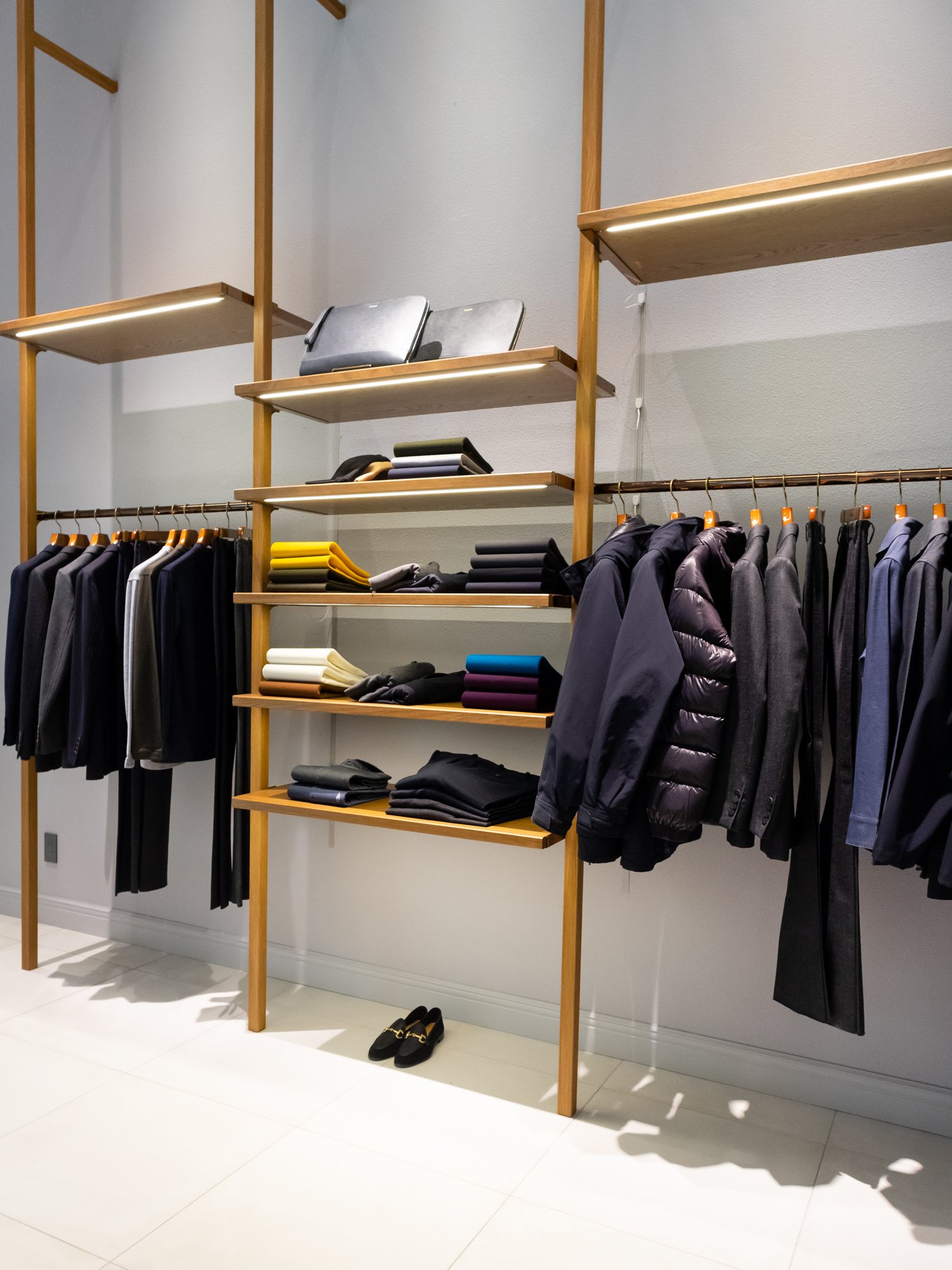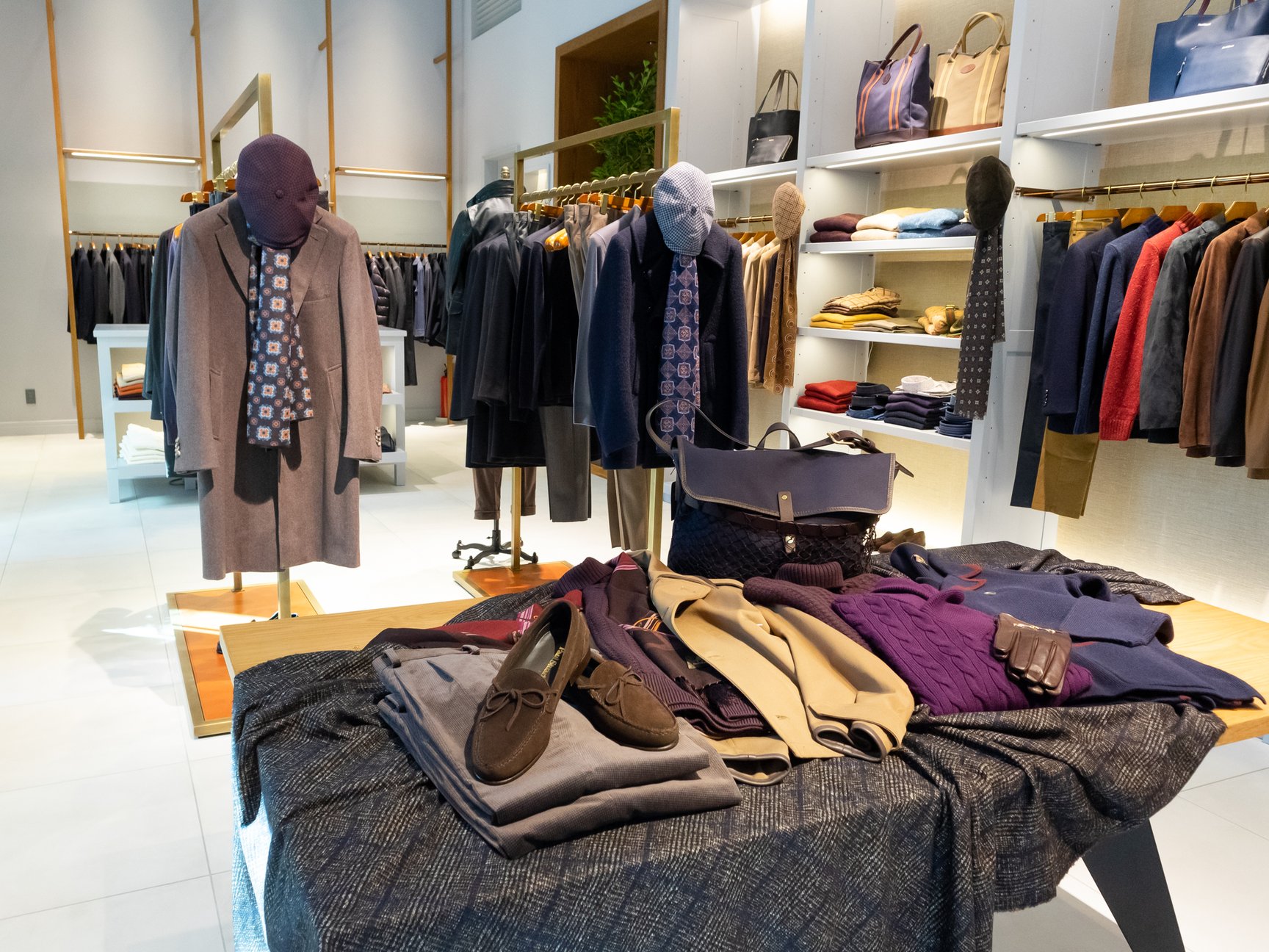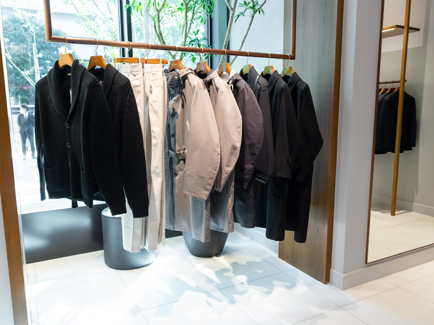 メンズカジュアルではコレクションラインをはじめ、百貨店でも販売している共通ライン、直営店限定アイテムを用意。メンズスーツではビジネスシーンからカジュアル、フォーマルシーンまで対応する。ウィメンズは、メンズのジャケットと同素材のワンピースや、メンズ仕様を取り入れたブレザーなどが揃う。メンズスーツをはじめとする一部アイテムはパターンオーダーが可能となっている。
