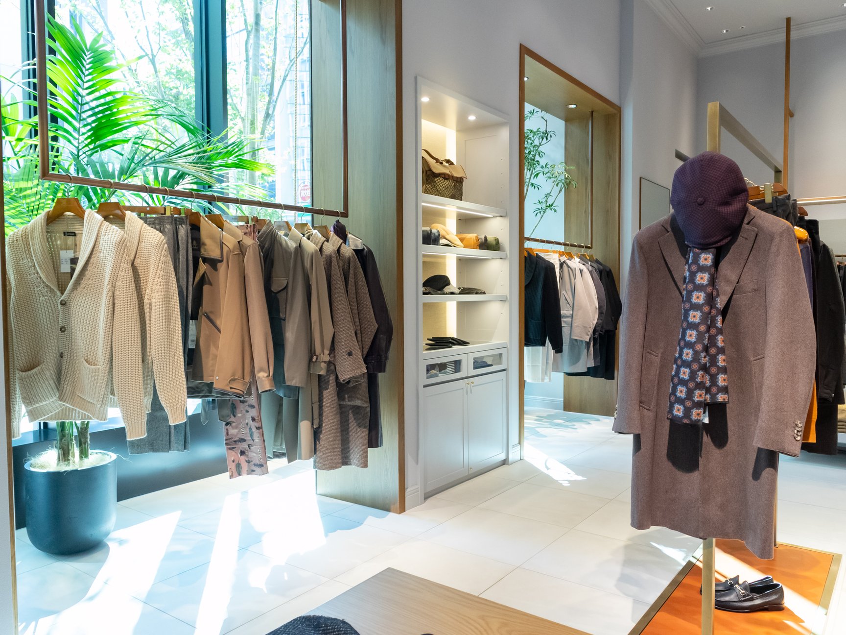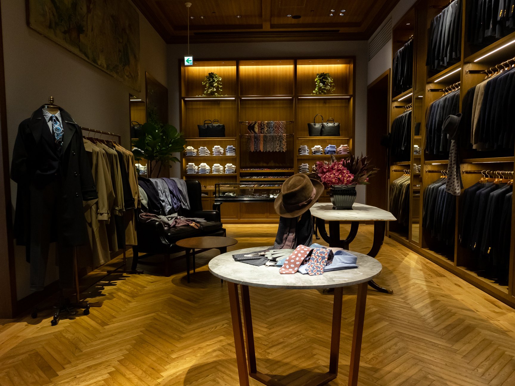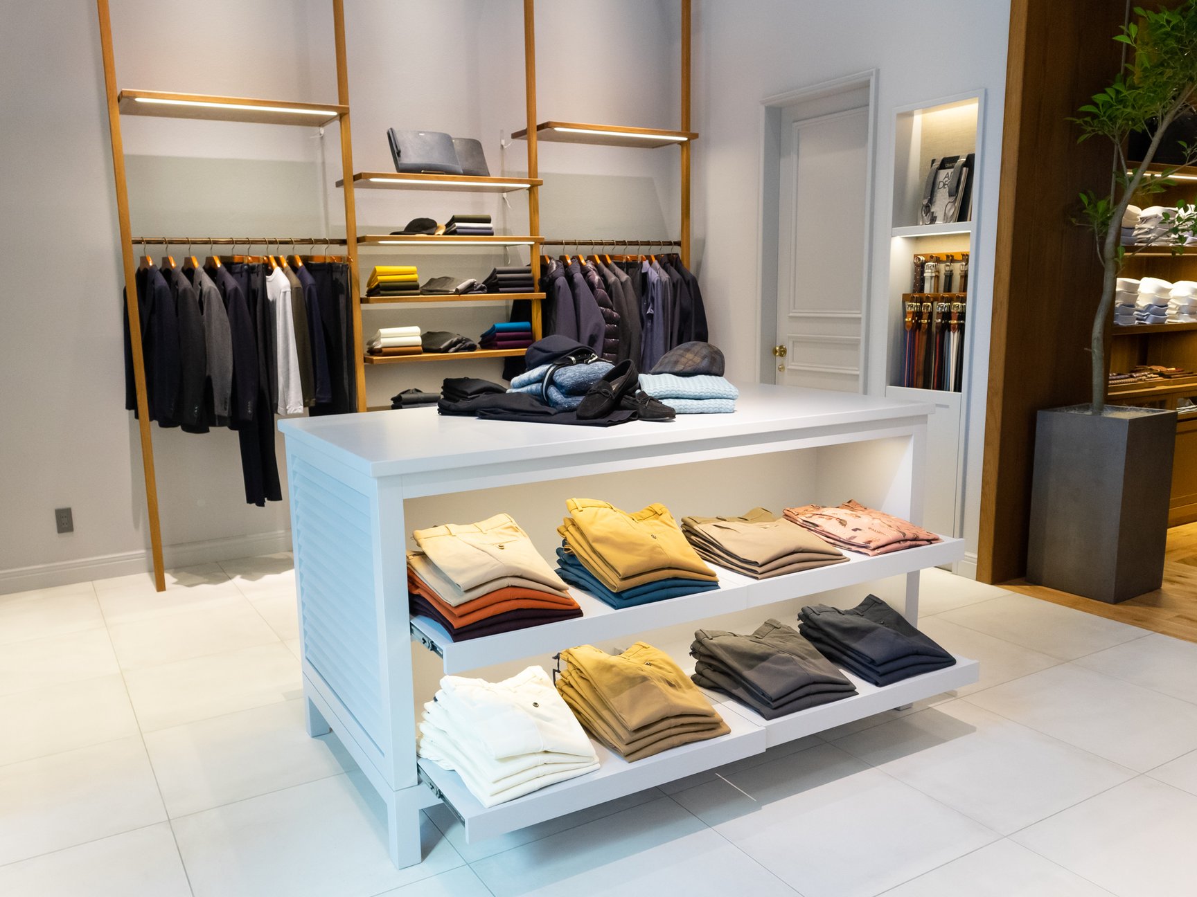 新たな旗艦店はコンセプトに「何処にもない、ここだけのPaul Stuart」を掲げる。売場面積は約325平方メートルで、重厚な雰囲気だった旧店舗とは対照的に、新店舗はシンガポールの「ラッフルズホテル」からインスピレーションを受け、モダンでコロニアルな店内に仕上げた。メンズカジュアル、メンズスーツ、ウィメンズの3つのファッションスペースに加え、日本初展開となるバー「The COPPER ROOM」、回廊スペースのコリドーの計5スペースで構成。ジ アーガイル アオヤマにはホテルやレストラン、オフィスなどが入居していることから、男女の幅広い層に対応する店舗として展開するという。
